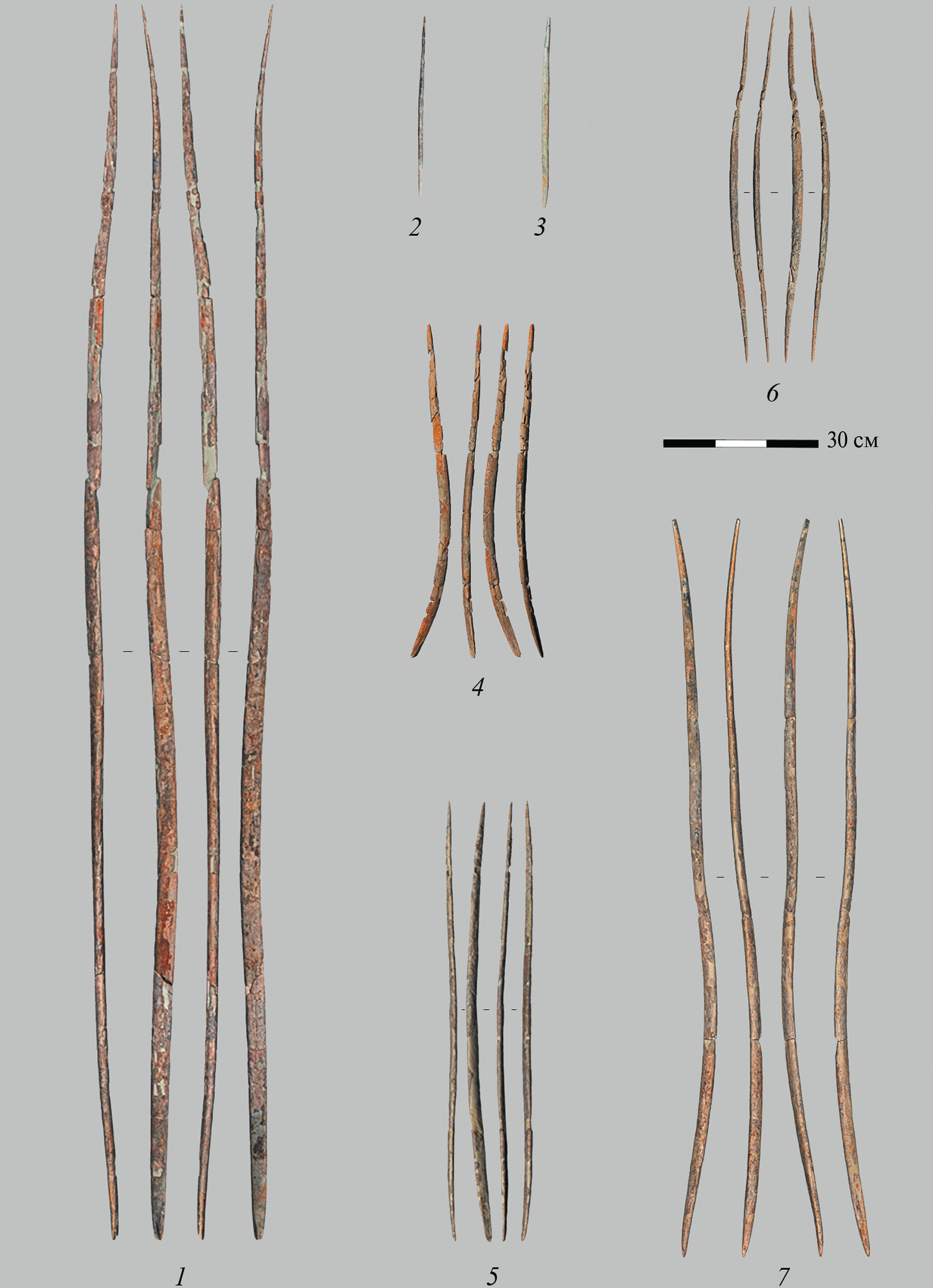О.Н. Бадером разработана классификация охотничьего оружия Сунгирской стоянки. Прежде всего, исходя из размерных характеристик предметов вооружения, которые, по мнению исследователя, определяли особенности их использования, они были поделены им на копья, дротики и кинжалы (Бадер, 1998). К копьям (рис. 2, 1) О.Н. Бадер отнес два самых крупных предмета, которые, как он считал, не могли использоваться в качестве метательного оружия. К категории кинжалов (рис. 2, 2, 3) – оружие длиной всего 0.35–0.4 м, которые помимо размеров характеризовались также иной ориентацией относительно тел погребенных. В могиле они залегали так, что их острые концы были обращены в сторону ступней погребенного, рядом с которым они находились, в то время как острия копий и дротиков, располагавшиеся рядом с ним же, – в сторону его головы (Бадер, 1998. С. 24). Все остальные предметы отнесены О.Н. Бадером к категории дротиков (рис. 2, 4 – 7), которые рассматривались в качестве метательных копий. До настоящего времени другие исследования, где структура комплекса охотничьего вооружения из парного погребения была бы предметом специального изучения, не проводились. Основное внимание археологов оказалось сфокусировано почти исключительно на находке двух крупных, длиной 1.66 и 2.47 м, копий и вопросах, связанных с техникой их изготовления, определением вида использованного костяного сырья, возможностью распрямления бивней мамонта такой длины.