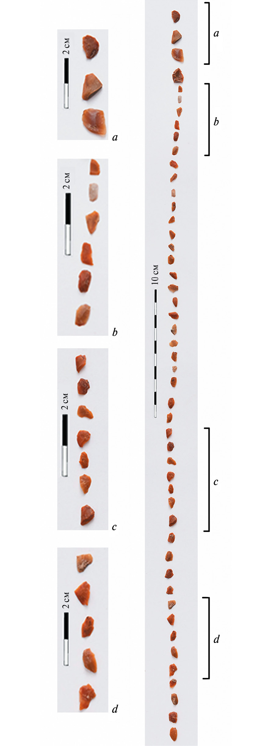 Рис. 7. Кремневые чешуйки из западной части парного погребения (В-33898/8598–8646), крепившиеся вдоль тулова древкового оружия вблизи его дистального конца