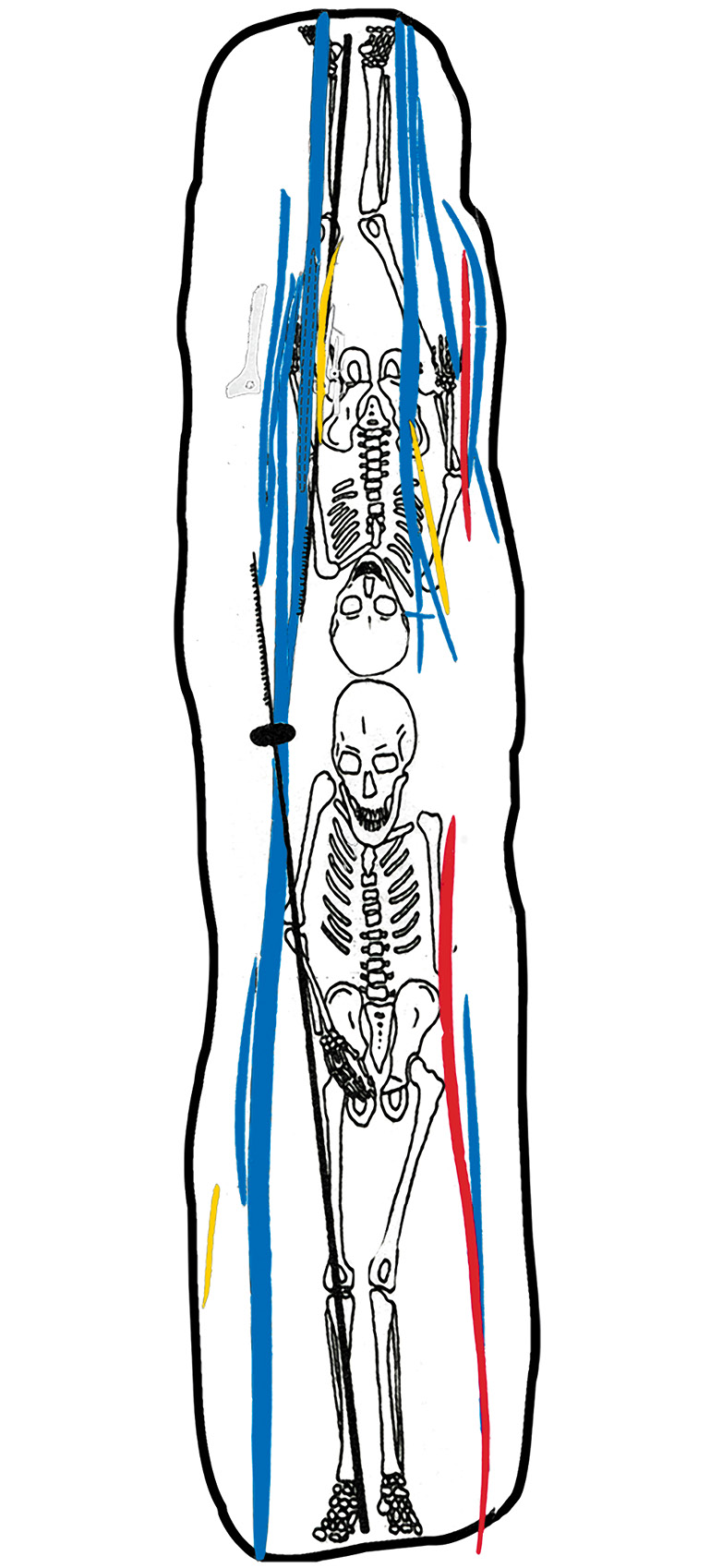 Fig. 8. Plan-diagram showing the location of different types of stuff weapons in the double burial pit. Colour designations: blue – weapons with beveled proximal ends and awl-shaped distal ends; red – weapons with double-edged ends; yellow – tips; black – reconstruction of wooden javelins by O.N. Bader. Drawing by the author (based on Bader, 1998. Fig. 76)