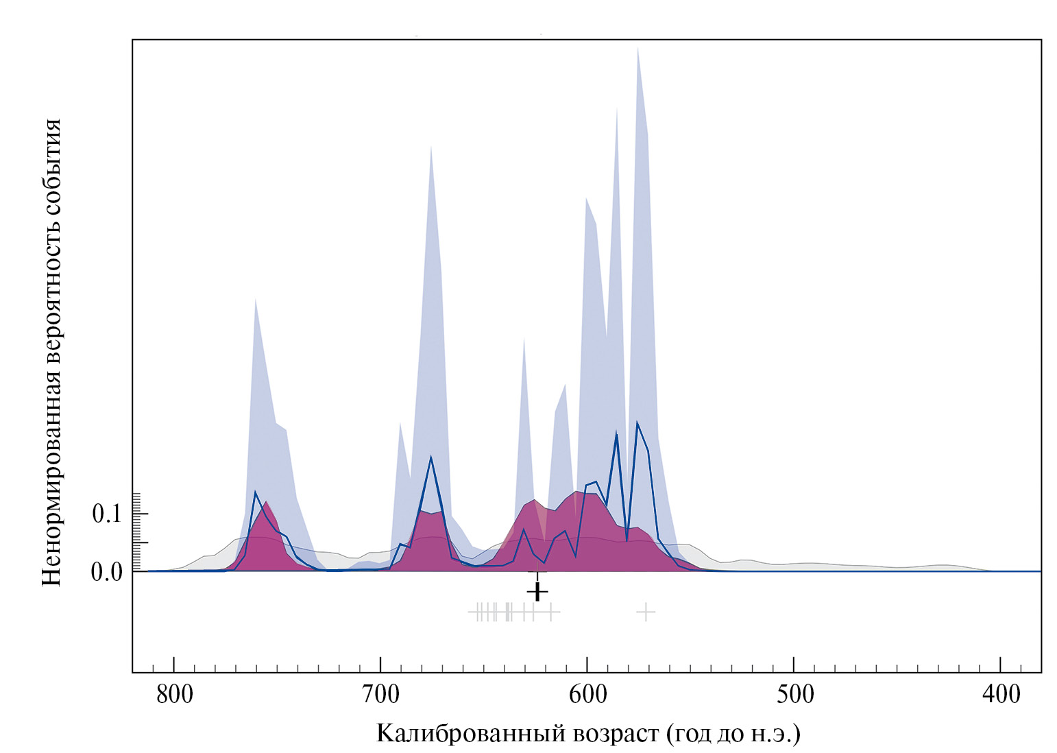 Согласно моделированию KDE (Aмодели = 142.5) (рис. 6) и MCMC (Aмодели = 144.2) (рис. 7), антропологические и остеологические материалы могут быть формально описаны в терминах одной фазы, которая компактно охватывает период 800–790 гг. до н.э. и 550 г. до н.э. Выявленная неравномерная мультимодальная форма распределения плотности вероятности (Crema, 2022) дает относительно мало доказательств в пользу возникновения событий до 650 г. до н.э. (точный критерий Фишера-Фримена-Гальтона для таблиц 3×2 (n=13) – p=0.0009), дополнительно ограничивая возможный период активной деятельности в насыпи кургана 7. Более того, результаты модели MCMC демонстрируют значительное пересечение ограничивающих фазу начального (790–570 гг. до н.э.) и конечного (770–550 гг. до н.э.) интервалов с разницей лишь в двадцать лет, что свидетельствует в пользу единого периода активности. По моделям KDE и MCMC ~625 и ~620 гг. до н.э. можно считать срединной календарной датой данного периода, при этом медианы отдельных апостериорных распределений для всех образцов близки к этим датам. Исключение из KDE модели образца GV-4818 с формально аномальной априорной индивидуальной медианой и самым высоким выходом коллагена (таблица) практически не влияет на срединную календарную дату, которая в подобной модели (Aмодели = 168.6) эквивалентна 630 г. до н.э. В целом, радиоуглеродные даты позволяют предположить, что деятельность на участке кургана 7 происходила единовременно приблизительно между 650 и 550 годами до н.э., причем медианная дата активности приходится на ~630–620 гг. до н.э. и в контексте методологической работы E. R. Crema (2022) может рассматриваться как наиболее вероятное время событий.