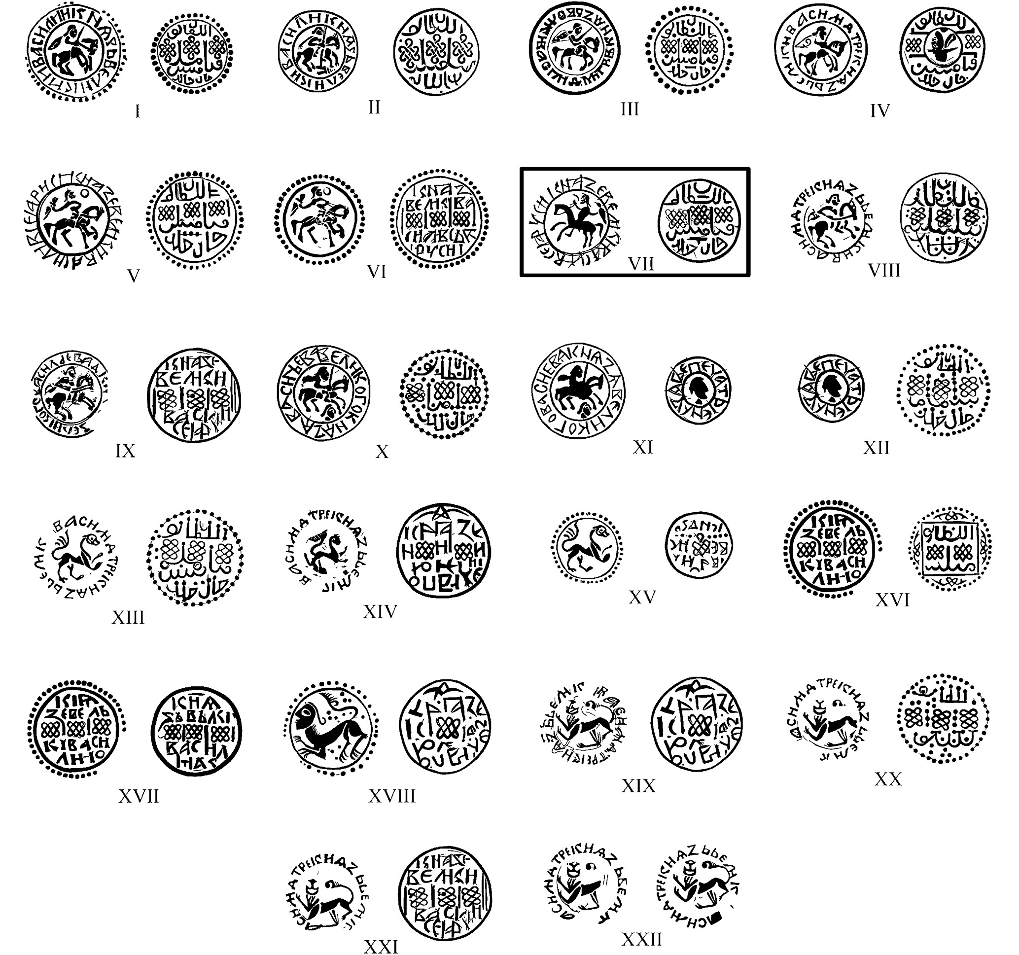 Настоящая статья посвящена изданию монет одного из типов с изображением всадника, заметно отличающихся от всех других монет этой группы: здесь всадник изображен скачущим влево. В правой руке он держит повод коня, а в левой – птицу (возможно, сокола). Вокруг изображения расположена круговая надпись: КНЯЗЕ ВЕЛИКИ ВАСИЛИ ВСЕЯ РУСИ или КНЯЗЕ ВЕЛИКИ ВАСИЛИ ВСЯ. Другую сторону занимает трехстрочная арабская надпись с именем Токтамыша (рис. 1, VII).