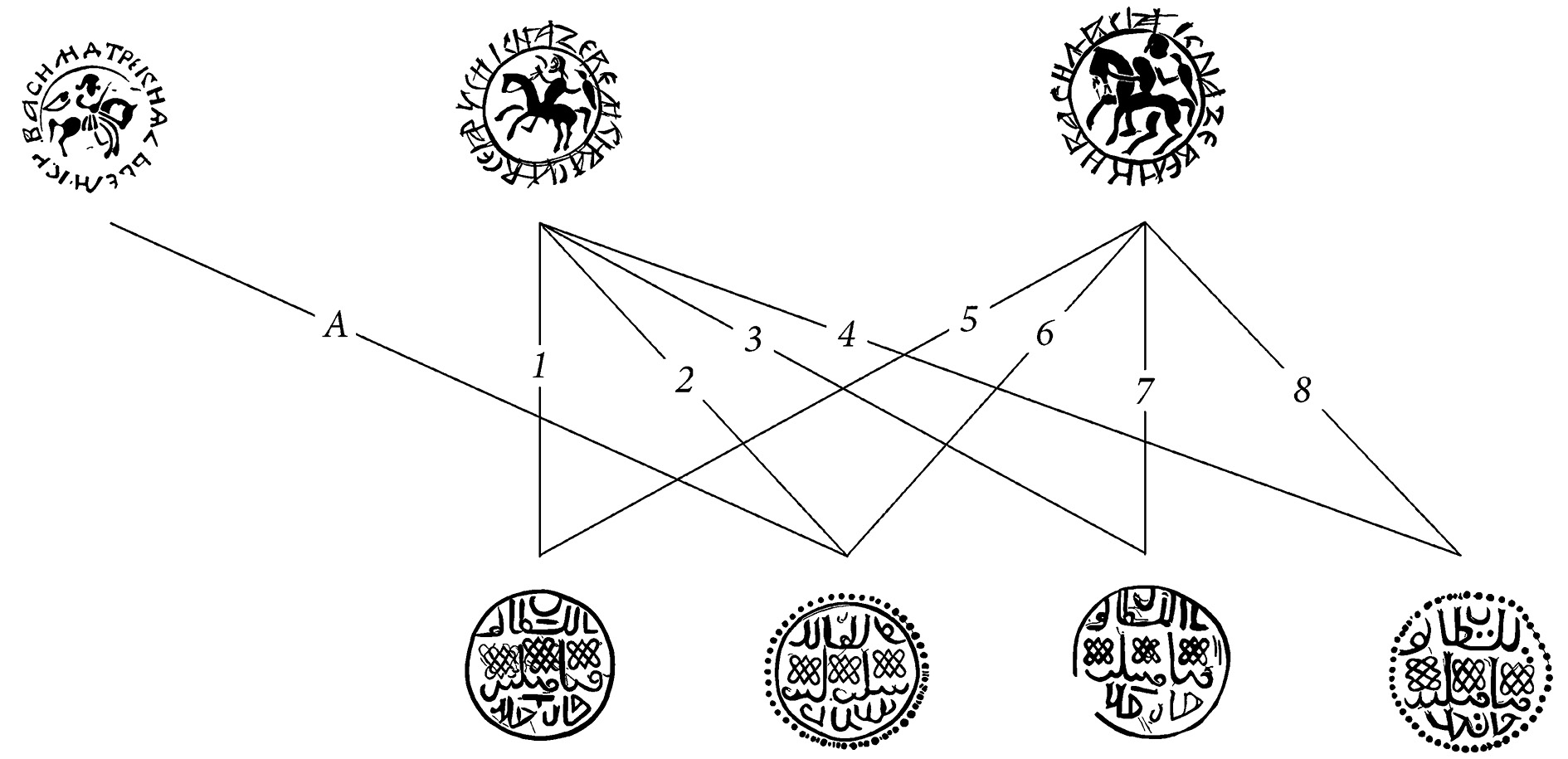 Рис. 2. Схема штемпельных связей денег с изображением всадника с соколом, скачущего влево (тип VII). 1–8 – варианты 1–8; А – денга с изображением всадника вправо (тип IV), связанная общим штемпелем с двумя вариантами типа VII. Прориси И. В. Гришина. Натуральная величина
