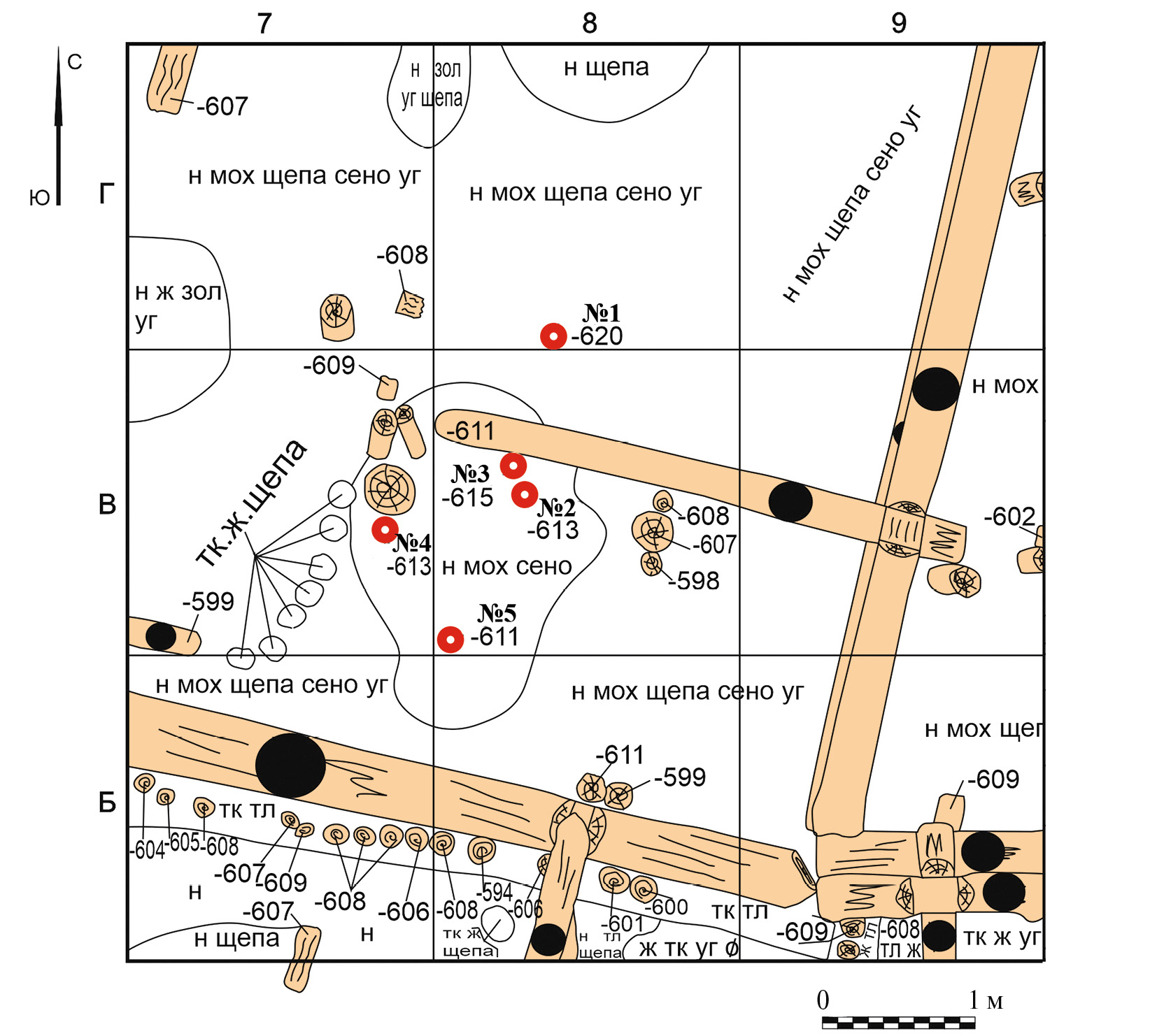 Рис. 3. Раскоп на ул. Боркова. Участок 3, западная часть. План на уровне −610 см. Схема пробоотбора
