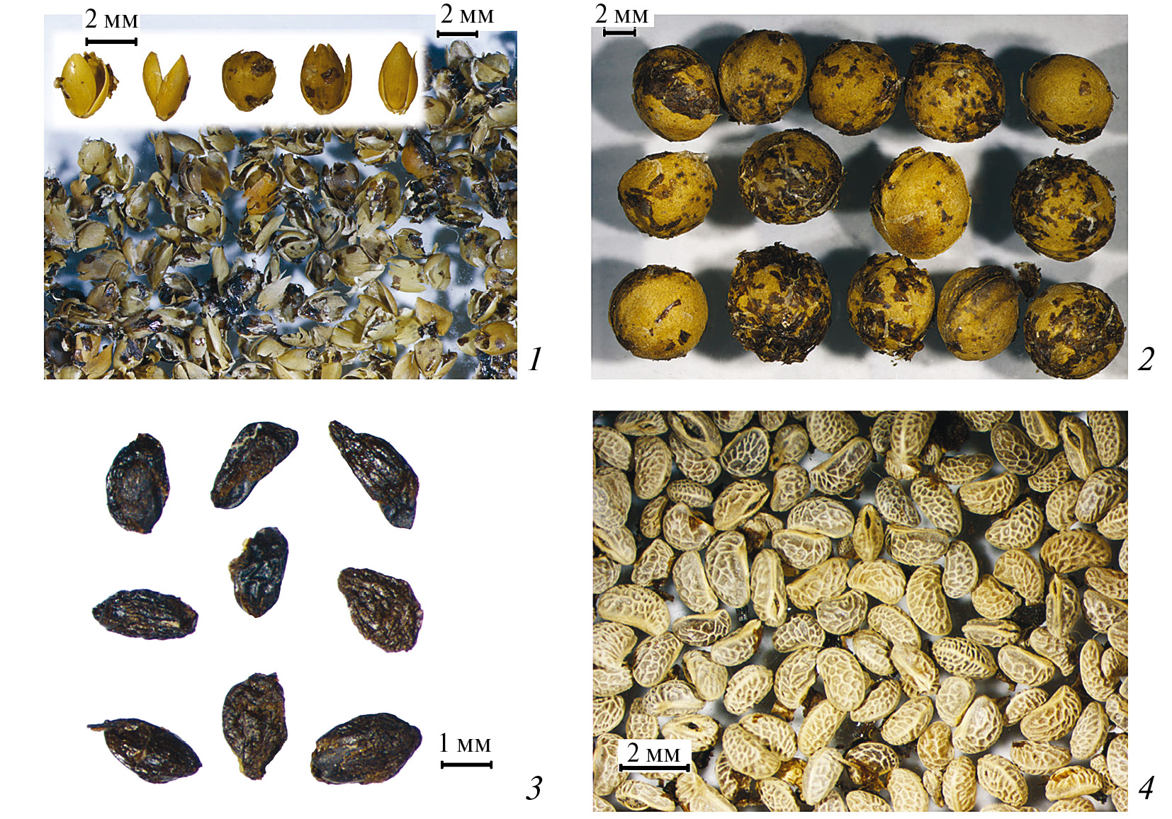 Рис. 4. Макроостатки пищевых растений: 1 – чешуи проса и “целые” зерновки, 2 – косточки вишни, 3 – семена смородины, 4 – семена малины