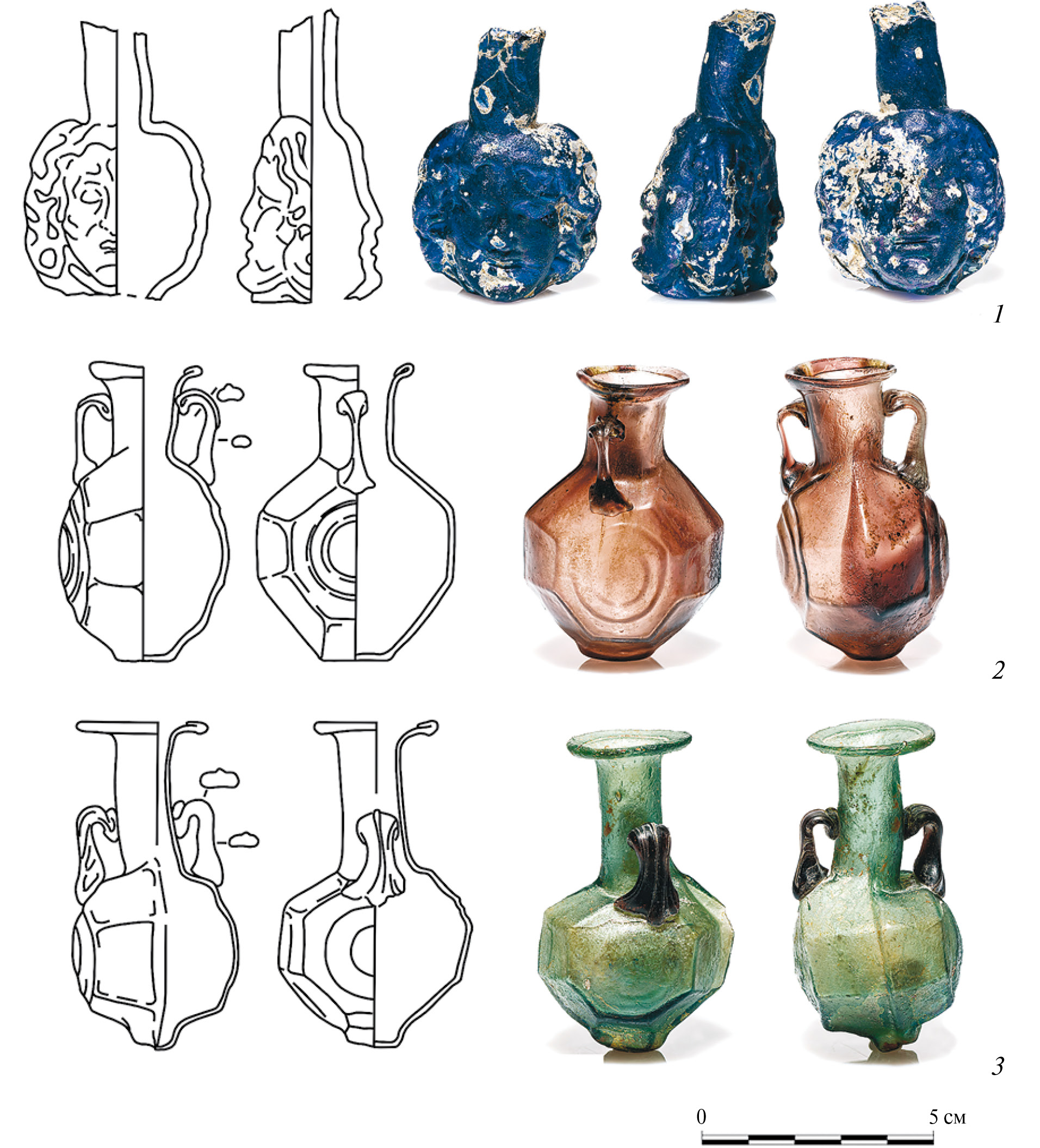 Миниатюрные сосуды из собрания ГИМ. 1 – флакон с двусторонним изображением головы Медузы из собрания А.С. Уварова; 2 – граненый амфориск из собрания В.И. Сизова; 3 – из раскопок в Урбниси, Грузия