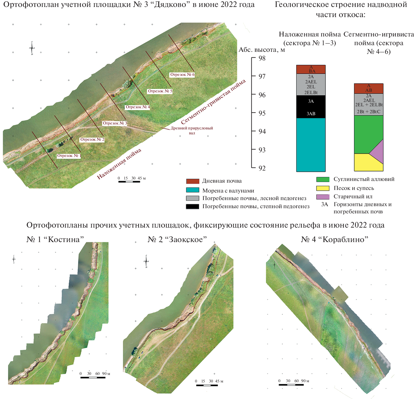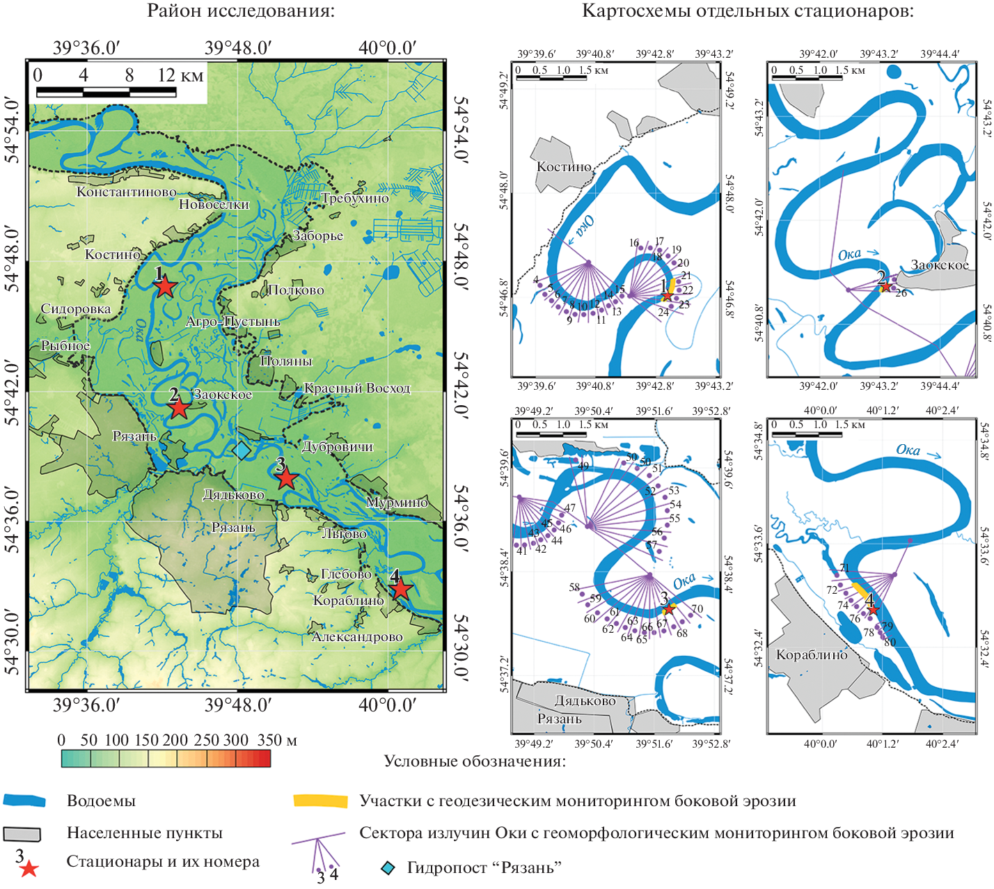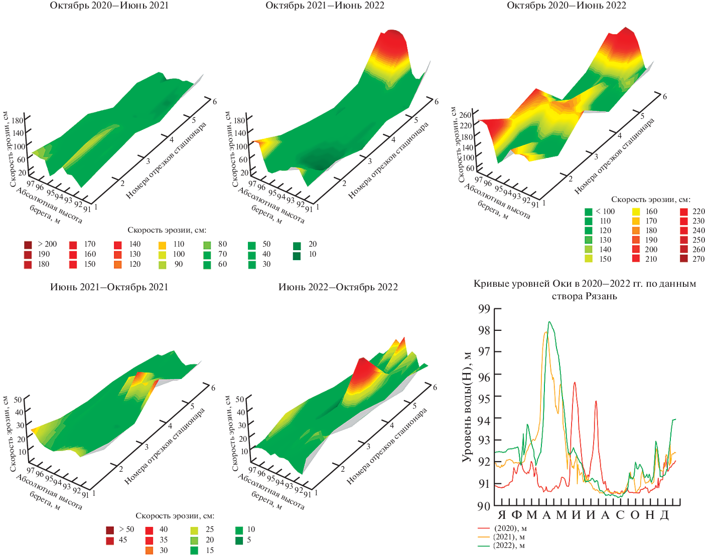 Среди опасных геоморфологических процессов на крупных равнинных реках выделяется направленный размыв их берегов. В среднем течении реки Оки – этого крупного притока реки Волги, горизонтальные русловые деформации вносят существенный вклад в региональную литодинамику и сокращение площади пойменных земель. Предпринятые нами полевые геолого-геоморфологические исследования долины выявили сложную фациальную архитектуру поймы. В совокупности с неустойчивостью водного режима Оки в последнее десятилетие, это способствует снижению качества прогнозов боковой эрозии ее русла, в том числе в окрестностях г. Рязани. Для детальной оценки последствий дестабилизации береговых откосов нами была осуществлена съемка их поверхности с помощью тахеометра и съемки с БПЛА-аэрофотосъемкой. Регулярный контроль эрозии по сезонам гидрологического года обеспечил получение фактических данных о перераспределении почвогрунтов по высоте откоса. Установлено, что эрозия в летнюю межень втрое слабее, чем во время половодья, выявлено также преобладание обрушений самой верхней (0.0–2.0 м от дневной поверхности) части фронтов размыва. В статье также обсуждается неодинаковая роль факторов рельефообразования в мобилизации отложений на высотных уровнях берегов стационаров, происходящая из локальных различий плейстоцен-голоценовой эволюции морфолитосистемы поймы реки Оки и записи в ней геологической информации.