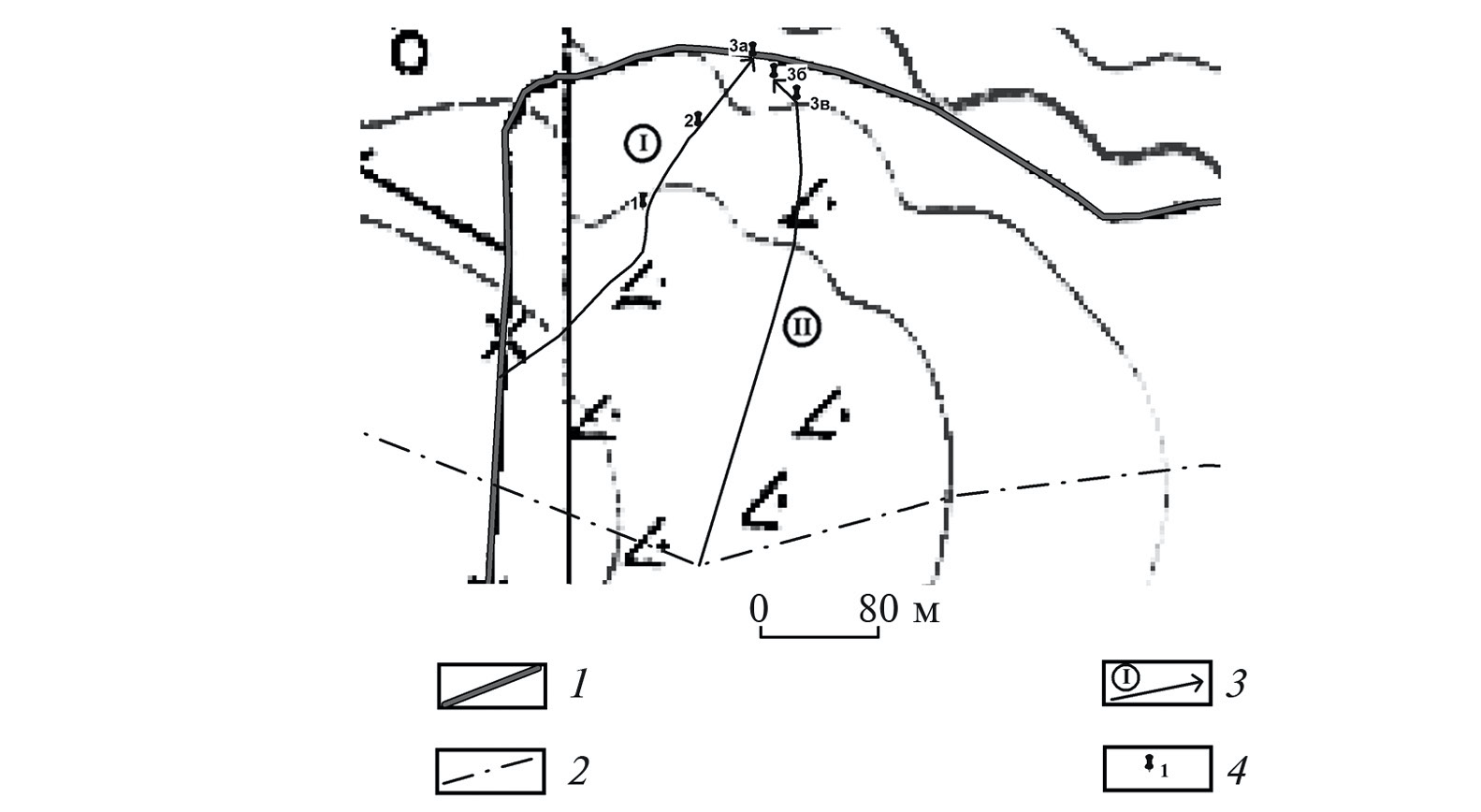Рис. 1. Схема северного массива участка Долгий Лог. 1 – граница северного массива; 2 – водораздельная линия; 3 – придорожная канава; 4 – номер склона.