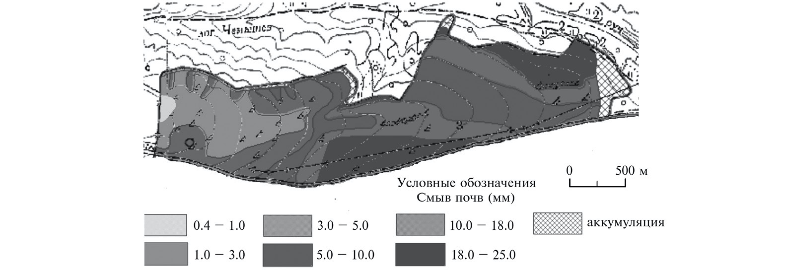 Интенсивность эрозии на различных элементах исследуемых пахотных массивов изменяется от «слабой» до «катастрофической» по классификации [22], измеренные значения смыва изменяются от 0.4 до 25 мм.