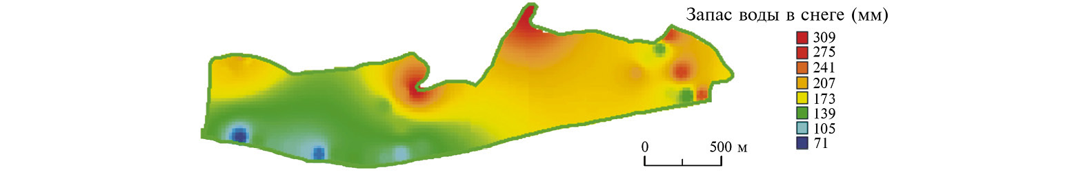 Рис. 7. Распределение величин снегонакопления на северном массиве участка Долгий Лог (усредненные данные за 2009–2017 гг.).