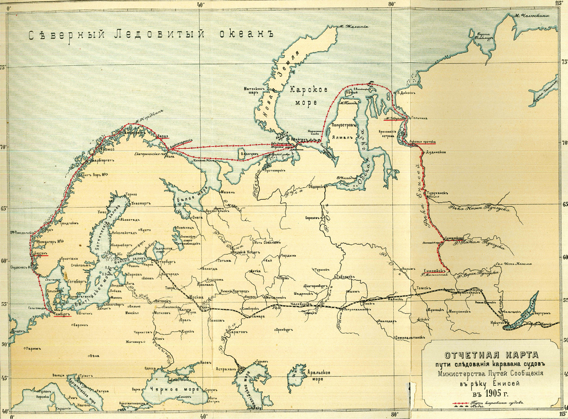 Северный путь, давно уже известный в западной его части, активно использовался еще в XVII в., однако малый ледниковый период затормозил его развитие. Впоследствии, уже в XIX в., промышленники М.К. Сидоров и А.М. Сибиряков активно продвигали идею возрождения «кружного морского пути» из Европы в Азию. После прохождения Карского моря А. Норденшельдом и Дж. Виггинсом (1874 г. – Виггинс достигает устья Оби, 1875 г. – Норденшельд Енисея, 1878 г. – знаменитое плавание Норденшельда на «Веге» в Тихий океан и др.) иностранные державы оценили идею использования пути для торговых отношений на азиатских просторах. Российские купцы также, закупая корабли за рубежом, принимали участие в использовании этого пути. Количество транспортных рейсов, совершенных по Северному Ледовитому океану в Сибирь, насчитывает с 1876 г. по 1900 г. 80 плаваний, однако, далеко не все из них были успешными [2].