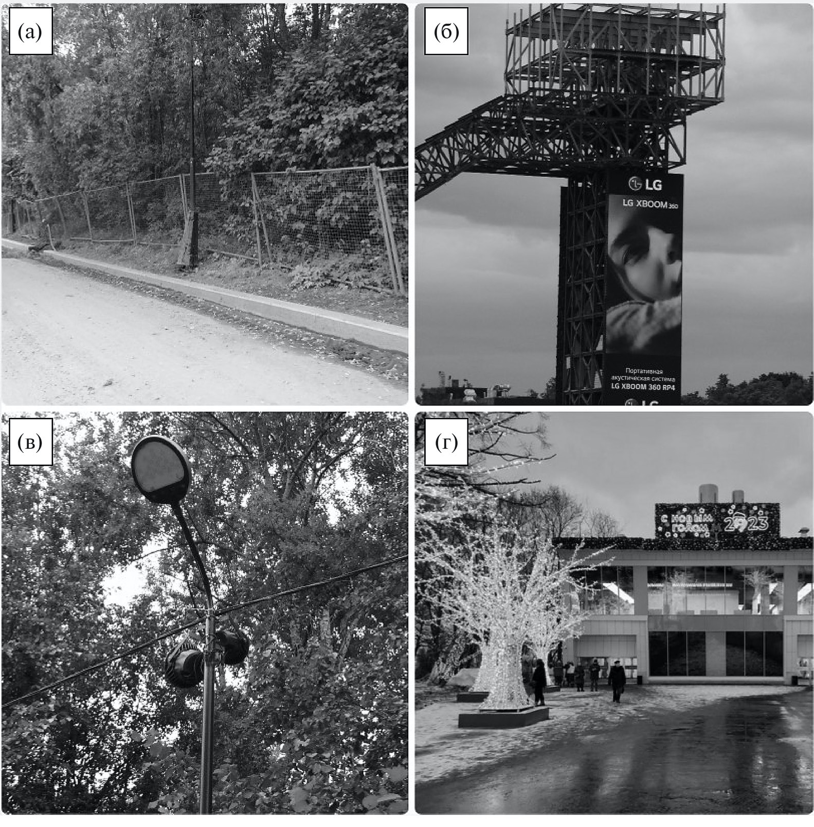 Визуальное загрязнение природного заказника «Воробьевы горы». Качественные характеристики визуального загрязнения парковых зон тесно связаны с эстетическими вкусами и традициями социума, однако как правило, они включают количественные показатели сохранности природного облика территории: площадь, структура и степень сохранности растительного покрова, наличие источников визуального загрязнения: защитных ограждений, билбордов, велостоянок, искусственной подсветки и т. п. [25, 32, 38]. Основываясь на обобщении показателей визуального загрязнения парковых территорий различных районов мира и опыте собственных натурных наблюдений, мы выделили следующие их характеристики, типичные для природного заказника «Воробьевы горы». Площадь условно природных территорий с сохраненным растительным покровом – 60%. Структура растительного покрова вследствие, как правило, антропогенных причин претерпела существенные изменения: коренные широколиственные породы постепенно сменяются мелколиственными, лесные участки – кустарниками и луговыми полянами, заболоченные участки осушаются, малоустойчивые к загрязненному городскому воздуху хвойные (изначально редкие в структуре древостоя) сменяются лиственными породами, увеличивается доля декоративных насаждений и сорных растений. Эти характеристики фиксировались при ландшафтно-экологическом обследовании территории и в последствии будут использованы для выделения наиболее эстетически ценных участков заказника, свободных от визуального загрязнения, для которых необходим особый режим сохранения. Элементами визуального загрязнения, нарушающими природную эстетику ландшафтов, являются следующие. Вдоль Воробьевской набережной на протяжении 1 км тянется сетчатый забор, ограждающий ее от заказника (рис. 1а) и искажающий зрительный образ лесной территории. Со строительством нового спортивного комплекса и канатной дороги на конструкции Большого трамплина высотой 30 м появились световые билборды, хорошо заметные на многих участках заказника (рис. 1б). Нарушают гармоничный природный пейзаж воздушная электропроводка освещения, которая могла бы быть убрана под землю (рис. 1в), искусственная подсветка деревьев гирляндами (рис. 1г) и т. п. Заметим, что территория природного заказника является ценным участком историко-культурного наследия Москвы, для которого непродуманное и часто избыточное освещение также неблагоприятно.