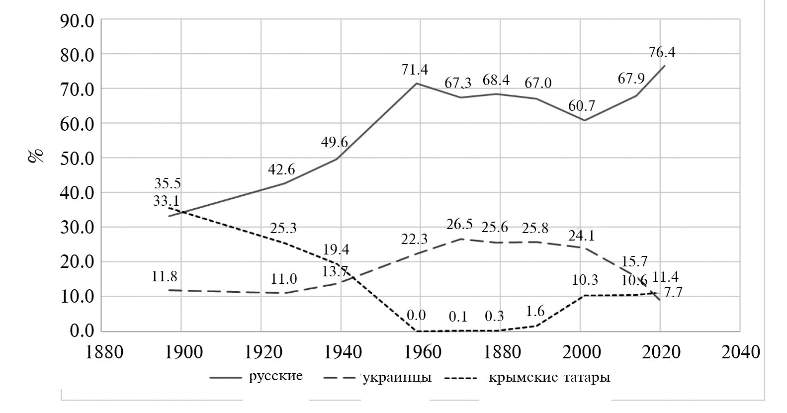 2. Fig. 1. Dynamics of the share of Russians, Ukrainians and Crimean Tatars in the number of those who indicated their nationality in Crimea from 1897 to 2021 (calculated according to [14, 24, 29]).