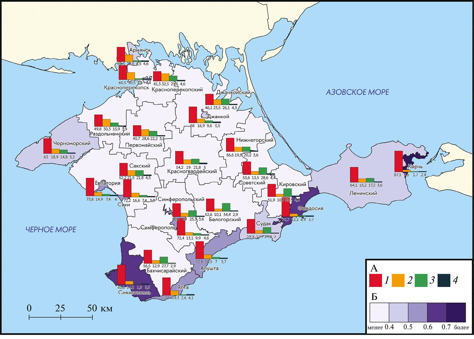 Рис. 3. Национальный состав населения и индекс этнической однородности городов и районов Крыма в 2014 г. (составлено В.М. Елисейкиной, рассчитано по [29]). А – Доля от указавших свою национальность представителей основных этнических сообществ Крыма в 2014 г., %: 1 – русские, 2 – украинцы, 3 – крымские татары, 4 – другие. Б – Величина индекса этнической однородности.