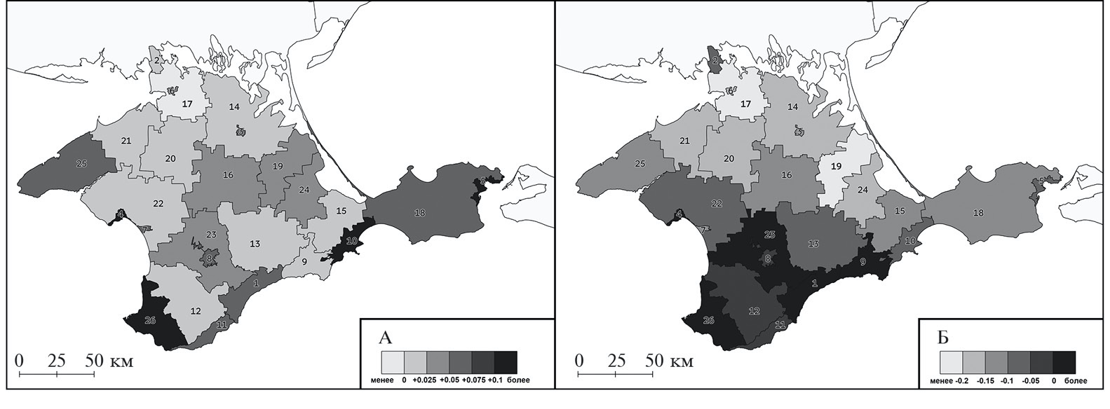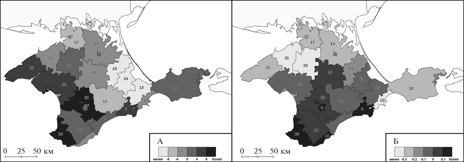 Данное перераспределение населения коснулось не только русского населения (рис. 5А), но и представителей других этнических сообществ, в том числе и крымских татар (рис. 5Б). Выявленное перераспределение населения в Крыму должно быть учтено при интерпретации изменения величины ИЭМ и ИЭО на уровне городов и районов, на что будет обращено внимание ниже.