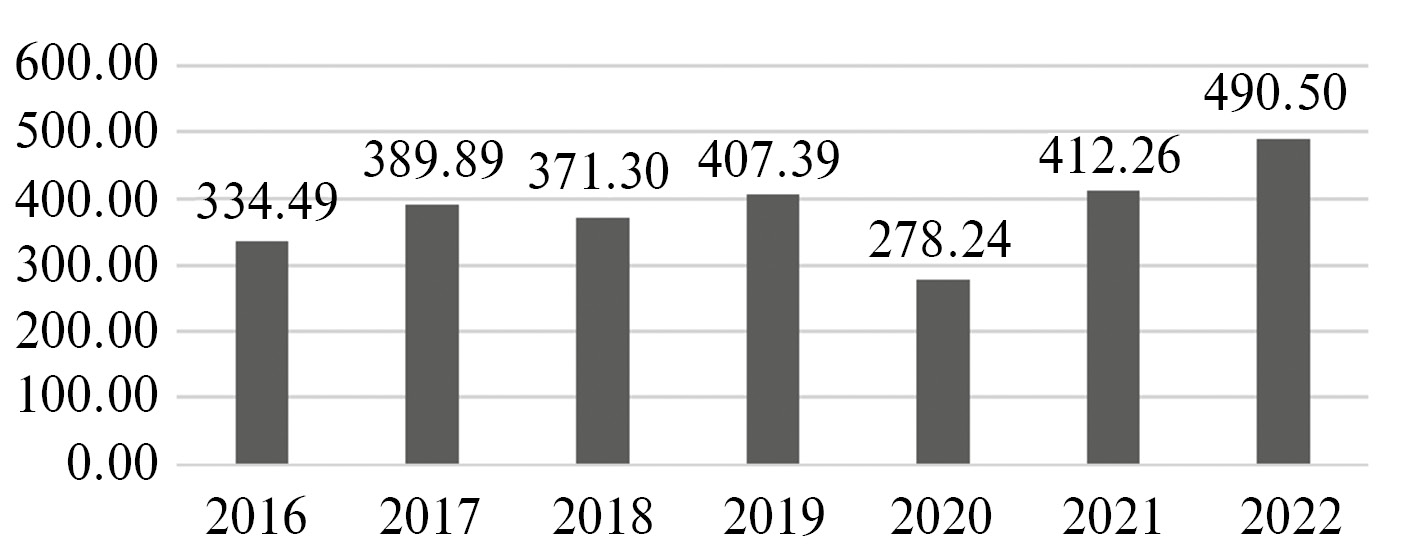 Fig.5. Income in the tourism sector in the Republic of Buryatia for 2016–2022, million rub. Compiled by [26].