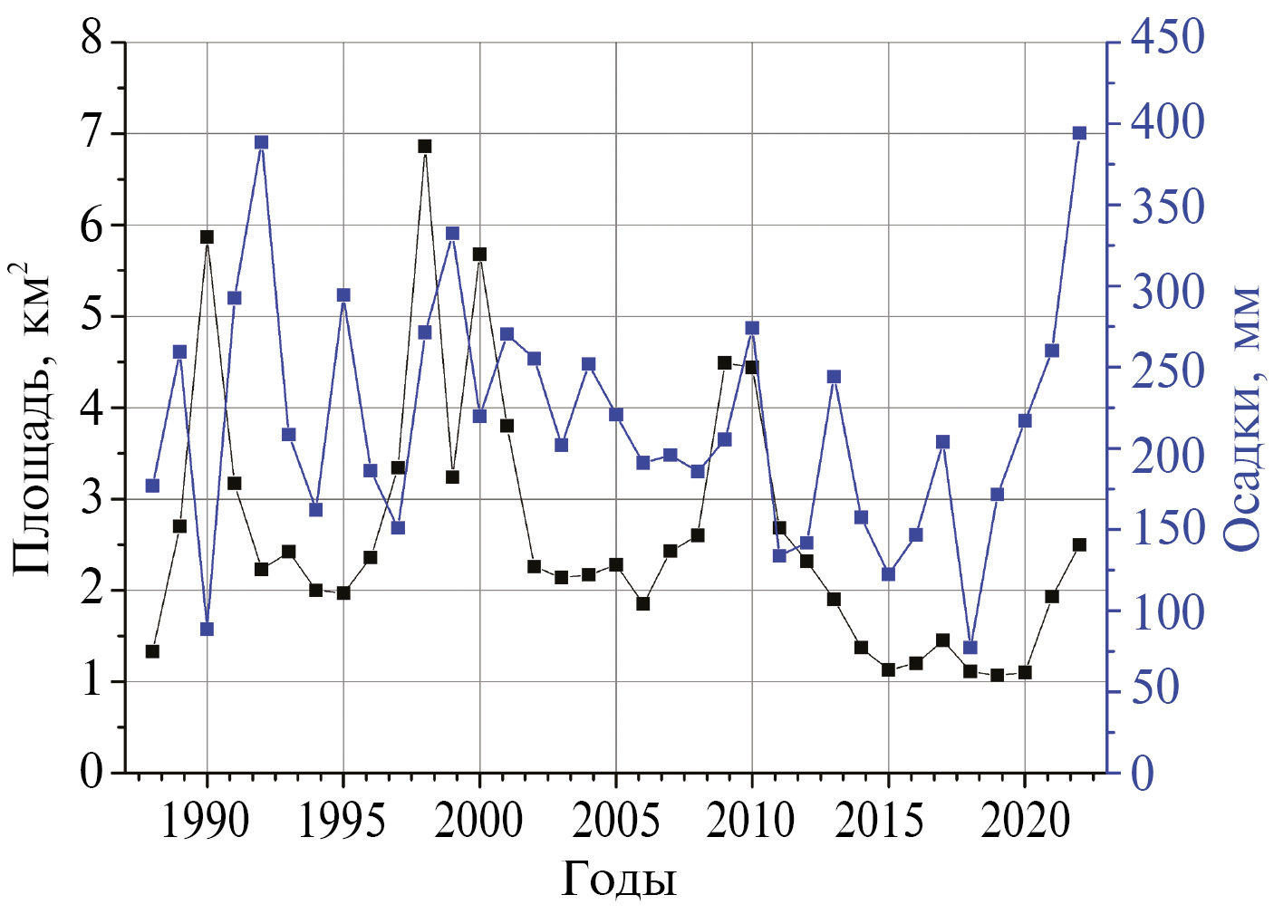 Рис. 3. Динамика площадей наледей на ключевом участке в сравнении с изменением количества осадков теплого сезона года, предшествующего наледеобразованию.