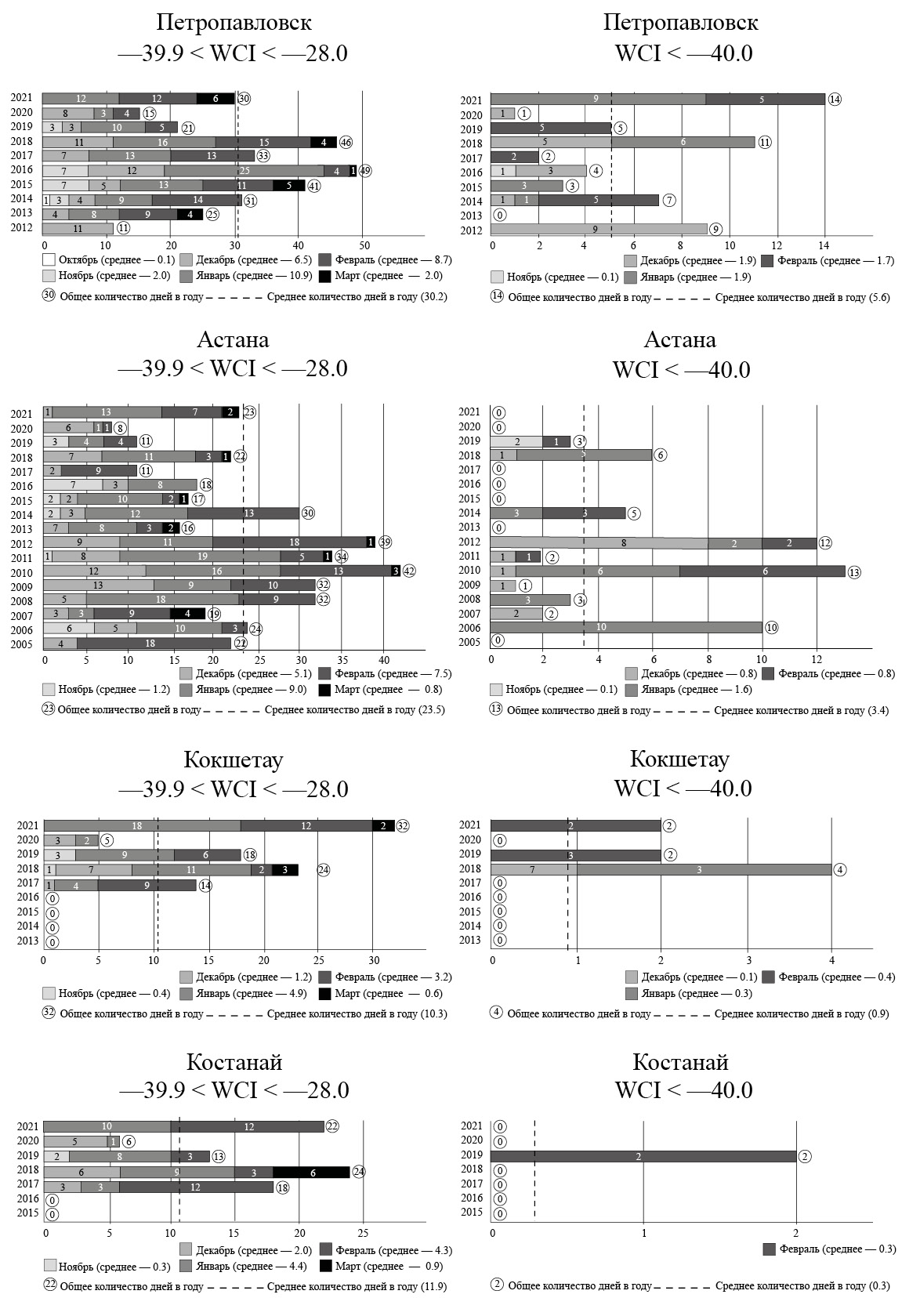 Fig. 1. The number of days with WCI values in two grades: –28.0...–40.0°С (left column) and < –40.0°C (right column) for the cities of Northern Kazakhstan (Astana, Petropavlovsk, Kostanay and Kokshetau) during the cold period (November–March). October is not represented on the charts, as no cases with medium and high risk of frostbite have been registered for it. Data for the months from November to March are shown with various shading. Within each month, the number of days of each grade is presented. On the right, the total number of days falling into this gradation for all months of the cold period in a particular year is given, the vertical dotted line shows the average number of days with this WCI gradation for the available observation period. The observation period varies by cities, the maximum coverage is 2005–2021.