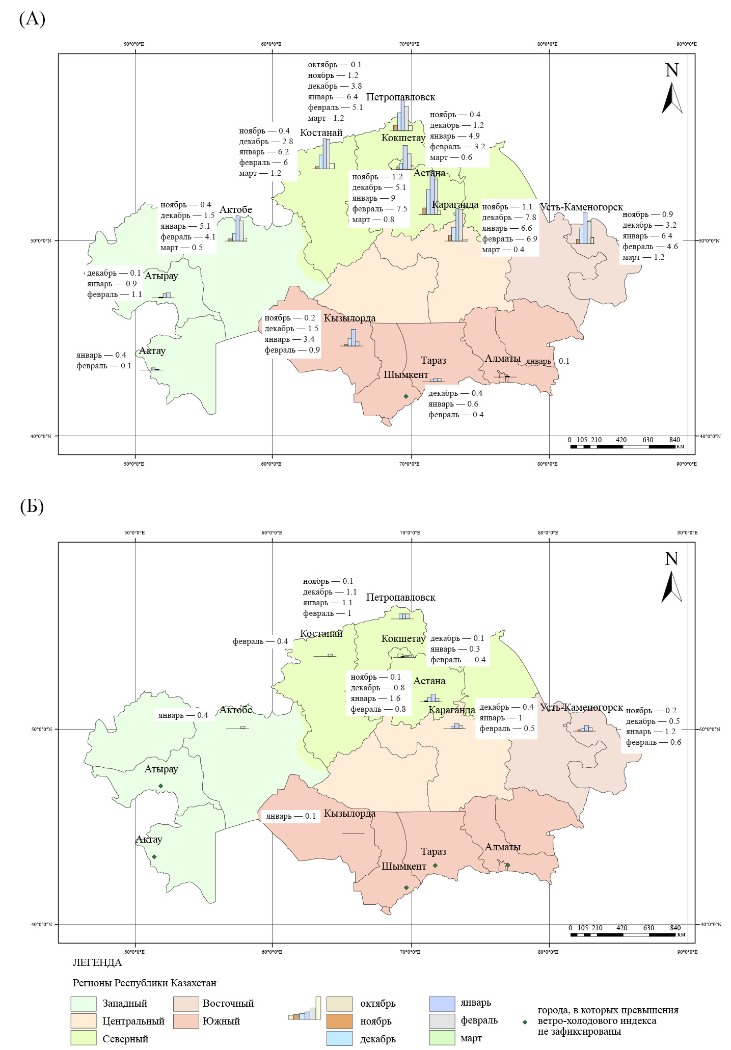 В течение анализируемого периода условия холодного стресса (средний риск обморожения) были зарегистрированы во всех регионах Казахстана, за исключением Шымкента; высокий риск обморожения отмечен в Северном, Центральном и Восточном Казахстане, с единичными случаями в южном и западном регионах. Максимальное количество дней, когда были превышены пороговые значения, приходится на январь и февраль по всему Казахстану. Однако в определенные годы первая часть холодного сезона (ноябрь–декабрь) может быть холоднее, чем вторая часть (январь–февраль). Минимум наблюдается в марте и в ноябре, в октябре случаев превышения пороговых значений не зафиксировано, поэтому данный месяц на рисунках не представлен. Анализ выявил значительную неоднородность условий холодового стресса на территории страны.