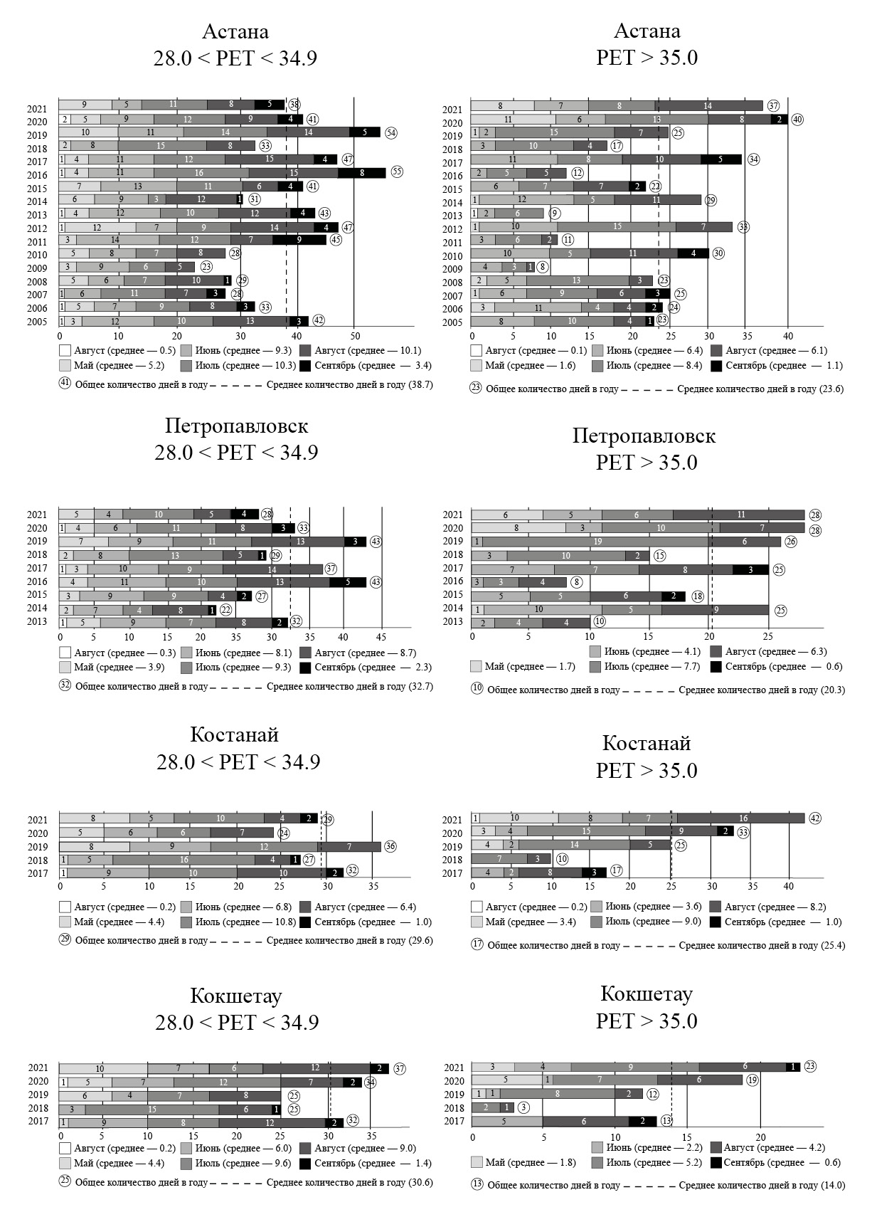 Даже северный регион Казахстана не может быть отнесен к термически комфортному в летний сезон, так как средняя повторяемость условий умеренного теплового стресса в среднем превышает 30 дней за год во всех городах, с максимумом в Астане (38.7 дней), а сильного теплового стресса 20 дней в году (за исключением Кокшетау, где она составляет 14 дней) с максимумом 25.4 дня в Костанае (рис. 5). Максимальная повторяемость сильного теплового стресса составила 19 дней в июле 2019 года и была отмечена в Петропавловске. Однако в отдельные годы в июле и августе не фиксируется ни одного дня с тепловым стрессом в городах Северного Казахстана.