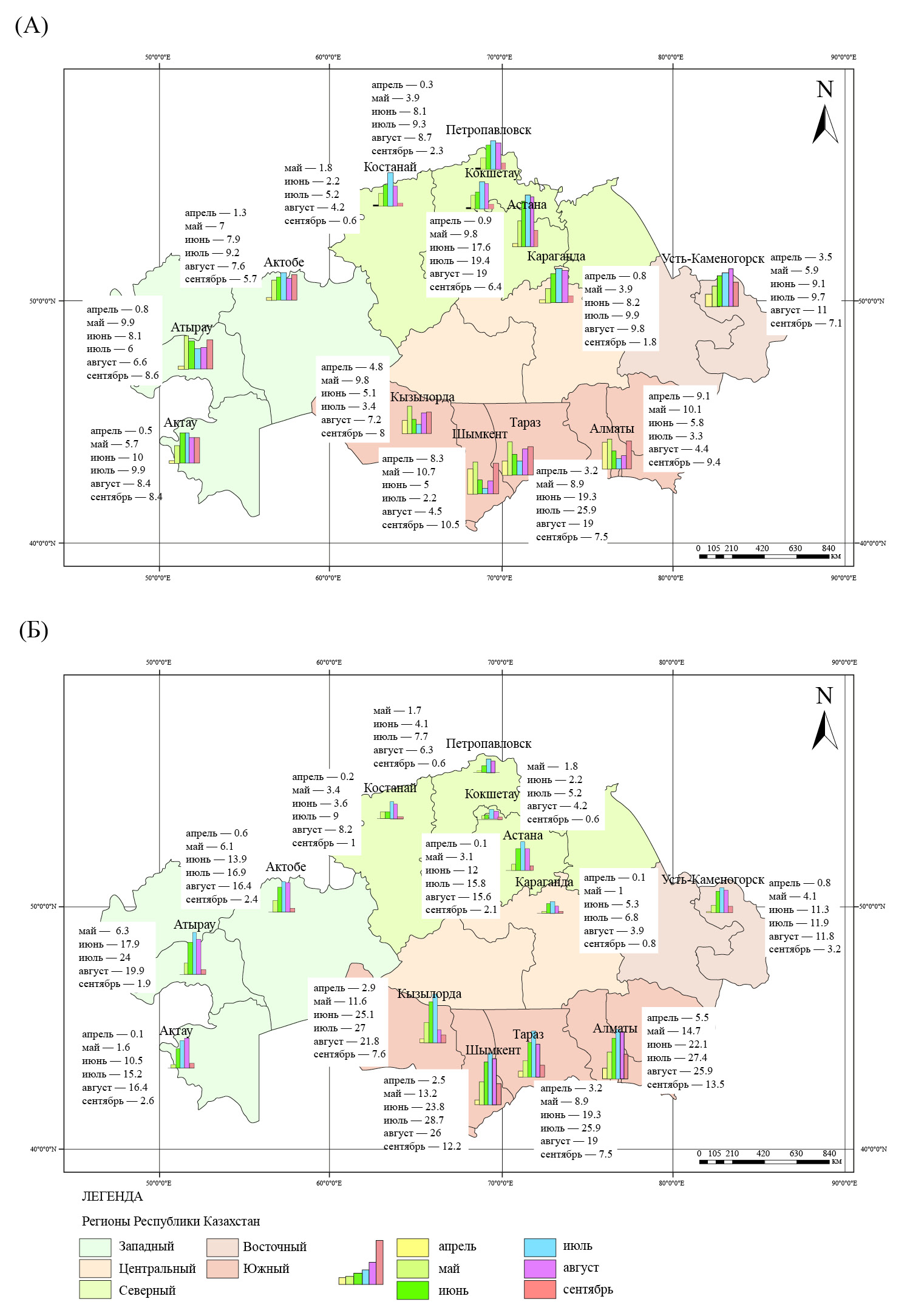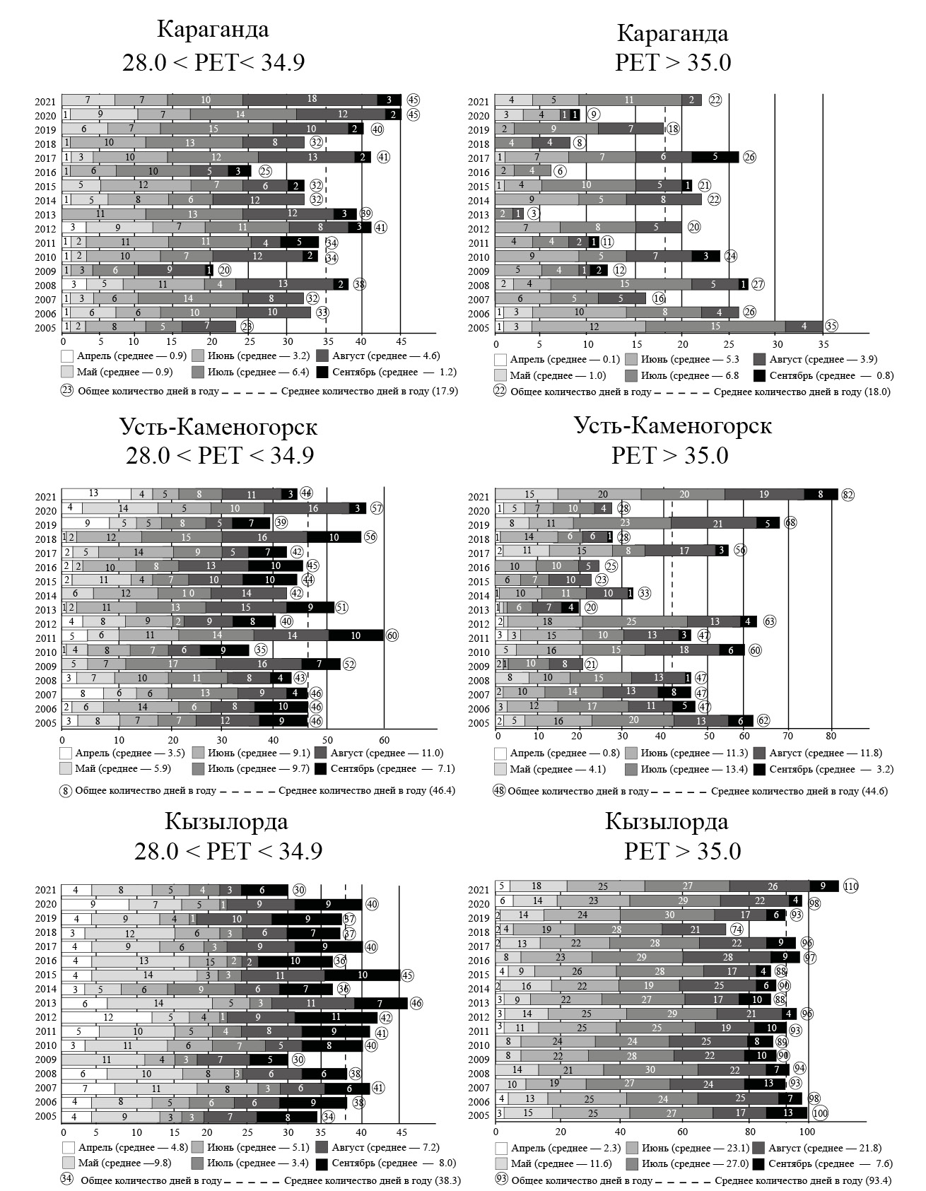 В Восточном Казахстане тепловой стресс наблюдается значительно чаще, чем на севере и в центре (рис. 6). Средняя повторяемость умеренного теплового воздействия составляет 46.4 дня, что является максимумом среди всех исследуемых городов, а сильного теплового воздействия — 59 дней. Сильное термическое воздействие наблюдается во все месяцы теплого периода с преобладанием летних месяцев. В июле количество дней с сильным термическим воздействием варьируется от 7 до 25 дней. В июне, июле и августе количество дней с сильным термическим воздействием значительно больше, чем с умеренным термическим воздействием, и даже в сентябре часто достигает 10 дней за месяц.