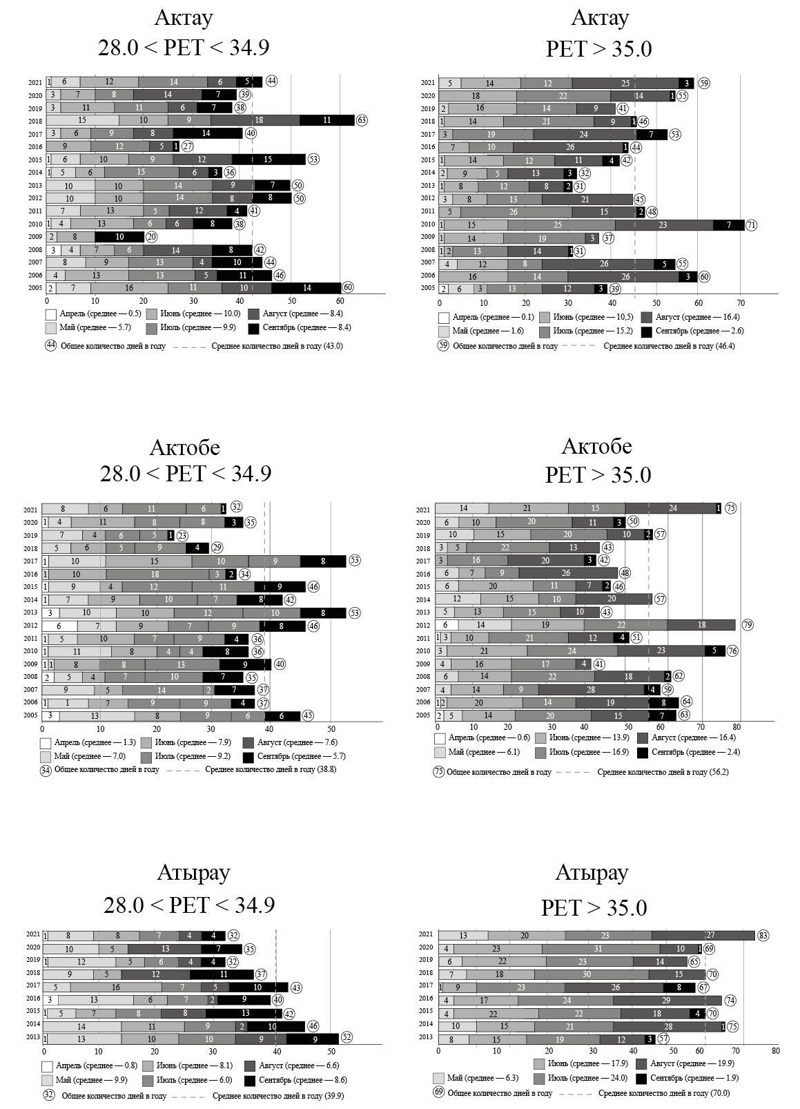 Table 6. Number of days with PET exceeding the thresholds for the whole available period of observation in cities of Kazakhstan; the mean value averaged over the period of available data