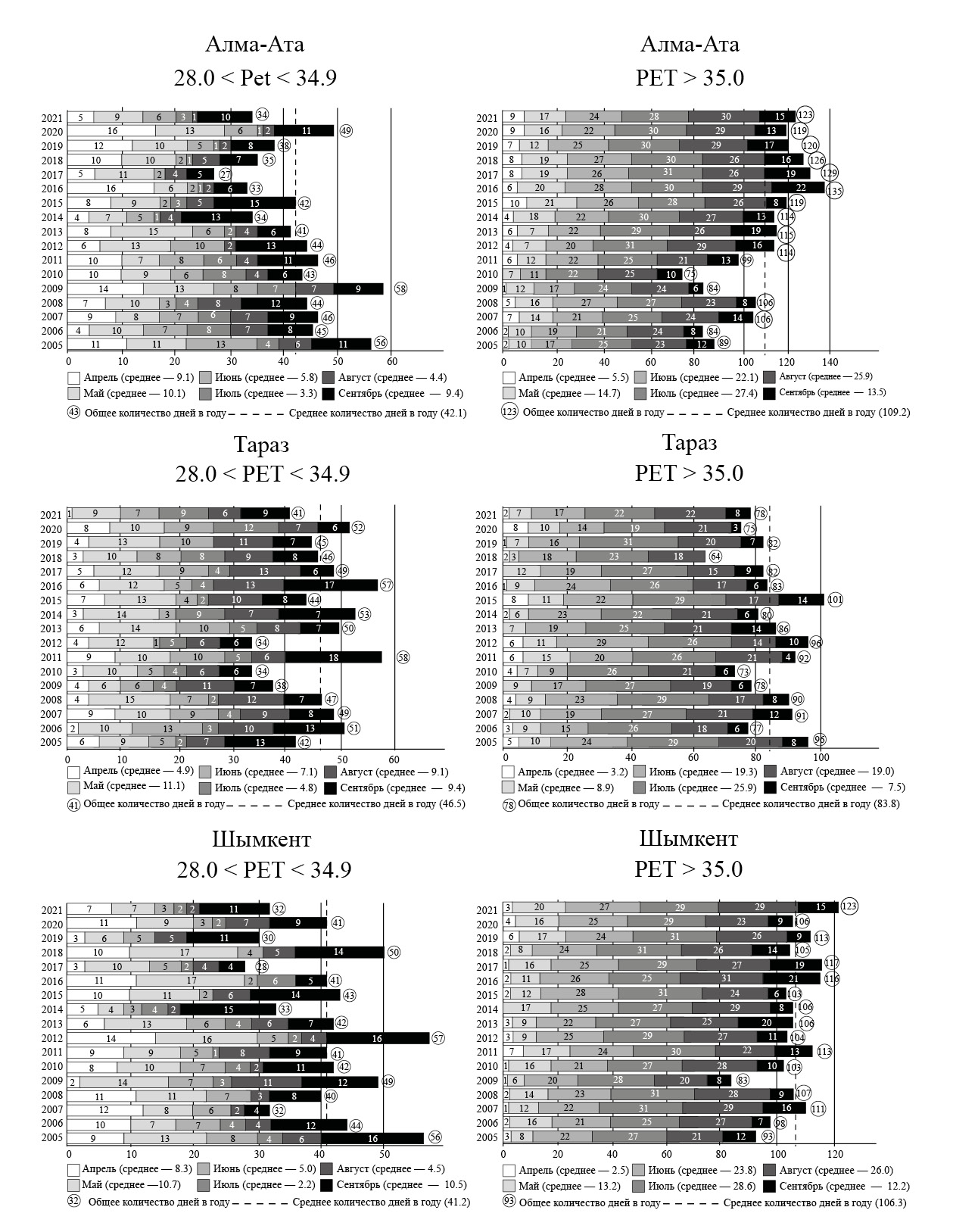 В городах Южного региона во все летние месяцы преобладают дни с сильным термическим воздействием (PET > 35°C) с максимумом в июле (рис. 8). Во всех городах, за исключением Тараза, в июне, июле и августе число дней с сильным тепловым стрессом превышает 20, достигая в отдельные годы 30 и 31 дня, то есть охватывает все дни месяца. В Таразе июнь и август отличаются немного более комфортными условиями. В остальные месяцы теплого полугодия в Южном Казахстане доминируют дни с умеренным тепловым воздействием. То есть на протяжении всего теплого полугодия практически не отмечается комфортных условий с точки зрения теплового воздействия.