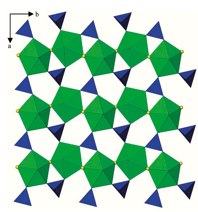 Каждая сульфатогруппа является мостиком между тремя полиэдрами атомов U, два из которых принадлежат к данному тетрамеру, а третий относится к соседнему тетрамеру. В результате образуются слои состава [UO2F2/2(SO4)3/3]∞– (рис. 4).