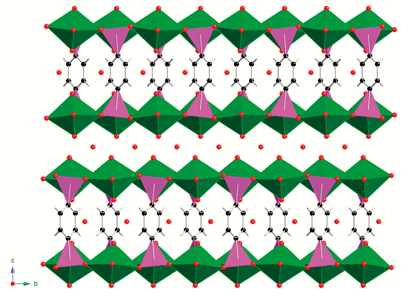 В кристаллической структуре [H3O]4{(UO2)4[C6H4(PO3)2]2F4}·H2O (Ubbp-2) содержится один кристаллографический уникальный центр U(VI), образующий пентагонально-бипирамидальные координационные полиэдры UO5F2 [15]. В окружении атома U находятся два атома O, занимающие аксиальные позиции в полиэдре и принадлежащие группе UO22+, три атома O от PO3 фосфонатной группы и два мостиковых атома F, образующие экваториальную плоскость пентагональной бипирамиды. Соединение (Ubbp-2) образует слоистую структуру. Посредством мостиковых фосфонатных групп полиэдры атомов U составляют одномерные цепи, которые фенильными фрагментами фосфонатных групп объединяются в столбчатую структуру (рис. 6). Два полиэдра UO5F2, деля общее экваториальное фторидное ребро, образуют димеры [(UO2O3)2]F2, связанные в слои посредством PO3 фрагментов фосфонатных групп. Катионы (H3O)+, нейтрализующие отрицательный заряд анионов {(UO2)4[C6H4(PO3)2]2F4}4−, и кристаллизационные молекулы H2O расположены между слоями.