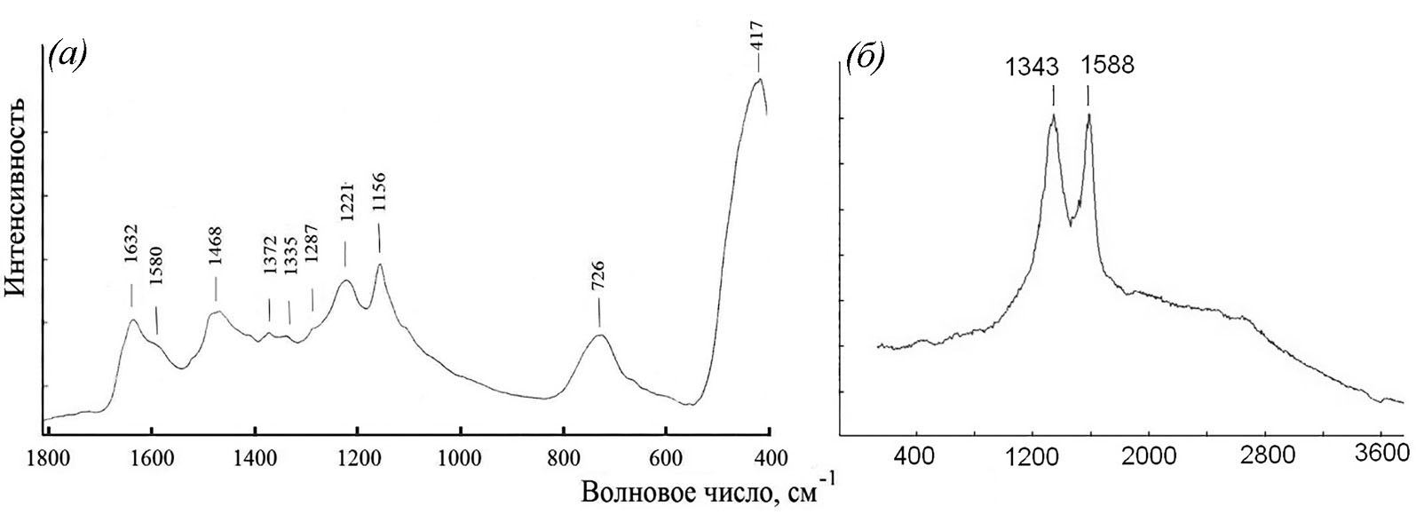 КР спектр образца 1 (рис. 3, б) содержит характерные G и D линии, которые отвечают наличию в образце графитизированных областей с разупорядочением структуры [16]. По приблизительной оценке, проведенной нами по формуле F. Tuinstra и J. Koening [17] L ≈ 4,4 (IG / ID), где L – размеры области, IG и ID – интенсивности пиков G и D, линейные размеры этих областей равны ~4,4 нм, т. е. области являются наноразмерными.