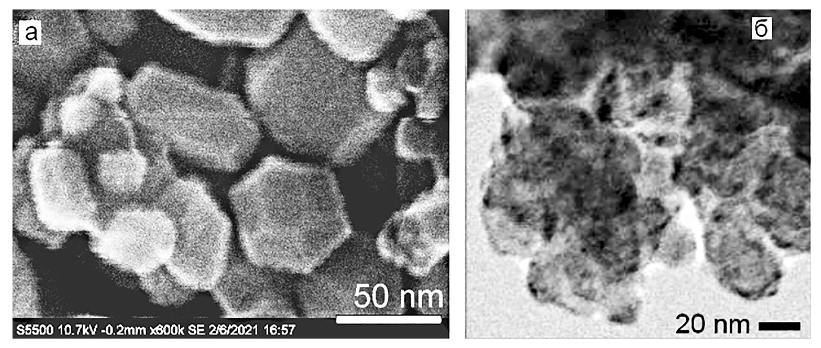 Морфологию образцов изучали на сканирующем электронном микроскопе (СЭМ) Hitachi S5500 (Япония) и на просвечивающем электронном микроскопе (ПЭМ) Libra 120FE (Карл Цейс, Германия). Рентгенофазовый анализ (РФА) выполняли на дифрактометре D8 ADVANCE (Германия) c использованием банка порошковых данных PDF-2. Магнитные характеристики образцов измеряли на СКВИД-магнитометре MPMS-XL-5 фирмы “Quantum Design” (США). Рентгеноэлектронную спектроскопию (РФЭС) осуществляли с помощью комплекса исследования поверхности фирмы SPECS (Bruker, Германия). Спектроскопия комбинационного рассеяния проводилась на рамановском микроскопе WiTec alpha500 (Германия) с длиной волны лазера 535,5 нм; инфракрасная спектроскопия – на ИК-фурье спектрометре марки EQUINOX 55/S (Bruker, Германия).