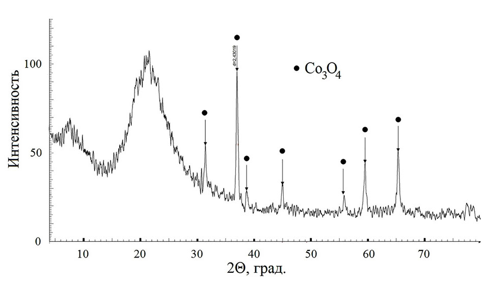 ИК спектр образца 2 отвечает спектру Co3O4 – полосы при 659 см−1 и 558 см−1 [19] (рис. 8, а) и подтверждает данные РФА. РФЭС данные указывают, что в поверхностном слое образца 2 кроме Co3O4 присутствует углерод (см. таблицу). Вероятно, он локализуется на поверхности нанокристаллов в виде пленки, имеющей нанометровую толщину, поэтому ИК спектрометру не хватает чувствительности для ее обнаружения. Метод же РФЭС обнаруживает углерод, так как известная глубина РФЭС анализа менее 10 нм.
