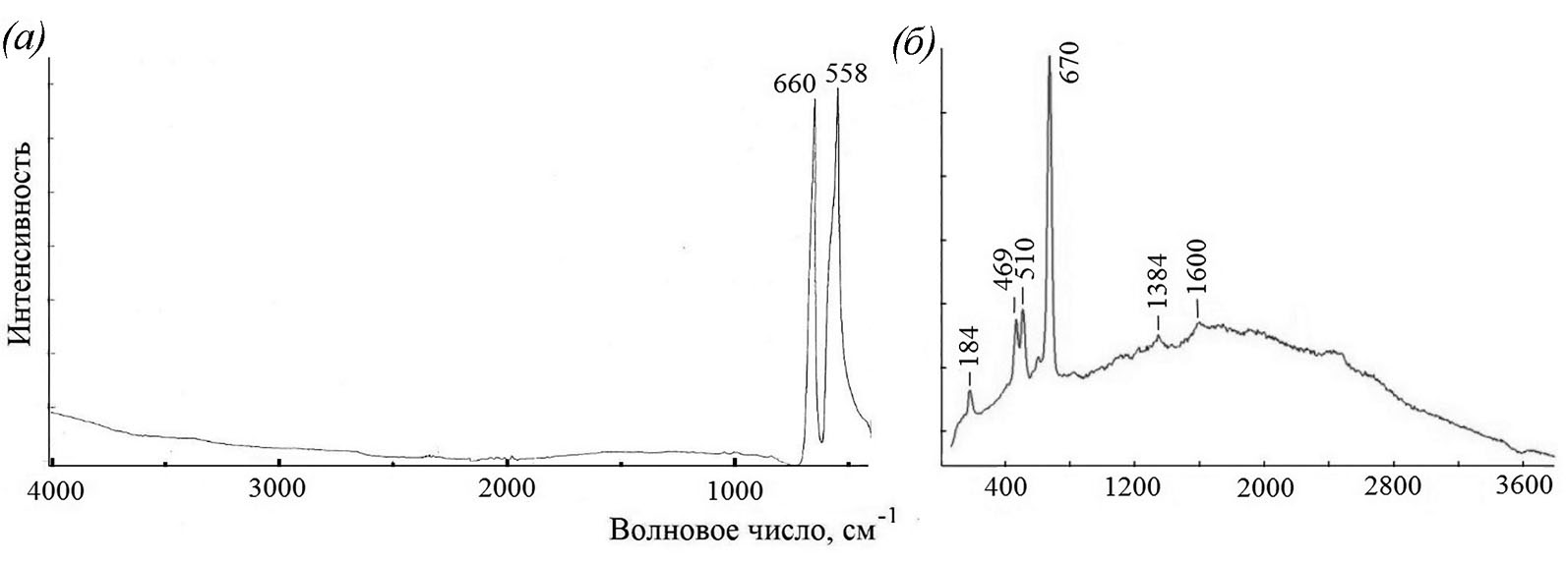 Рис. 3. ИК (а) и КР (б) спектры образца 1