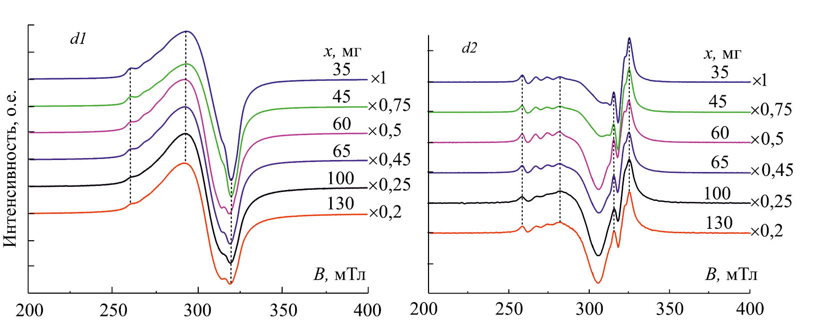 Рис. 1. Контуры первой (d1) и второй (d2) производной поглощения энергии микроволнового поля по внешнему магнитному полю порошками NTO-Cu-x (х = 35, 45, 60, 65, 100 и 130) при −160оС