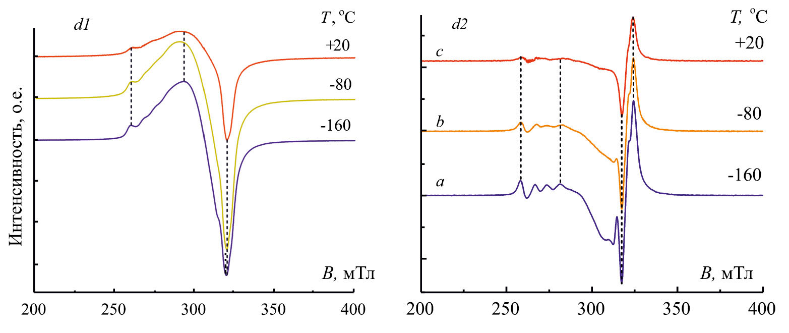 В изученных образцах при всех температурах исследований качественные виды контуров производных поглощения микроволнового поля характерны для соответствующих контуров порошков трехмерно-разупорядоченных кристаллических частиц, содержащих ионы с электронным спином S = 1/2 и ядерным спином I = 3/2 в кристаллическом поле с доминирующим осевым искажением [22, 23]. Это позволяет интерпретировать их как контуры спектров ЭПР примесных ионов Cu2+ (3d9, S = 1/2, I = 3/2), находящихся в соответствующем кристаллическом поле. Бòльшую размытость и худшее разрешение экстремумов контуров производных поглощения в образцах с бòльшим содержанием примеси, а в данном образце при более высоких температурах, особенно заметные в контурах вторых производных поглощения (рис. 1, d2 и 2, d2), можно объяснить увеличением ширин резонансов на частицах порошка, соответственно вследствие усиления спин-спиновых взаимодействий между примесными ионами и увеличения скорости спин-решеточной релаксации.
