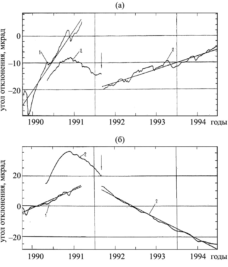Рис. 5. Временные ряды углов отклонения продольной оси геомеханического датчика от отвесной линии в направлениях С–Ю (а) и З–В (б), характеризующие изменение вертикального градиента горизонтального смещения на горе Толстый Мыс (1) и сопке Петровская (2). Стрелкой указан момент землетрясения 2 марта 1992 г. с М = 7,1