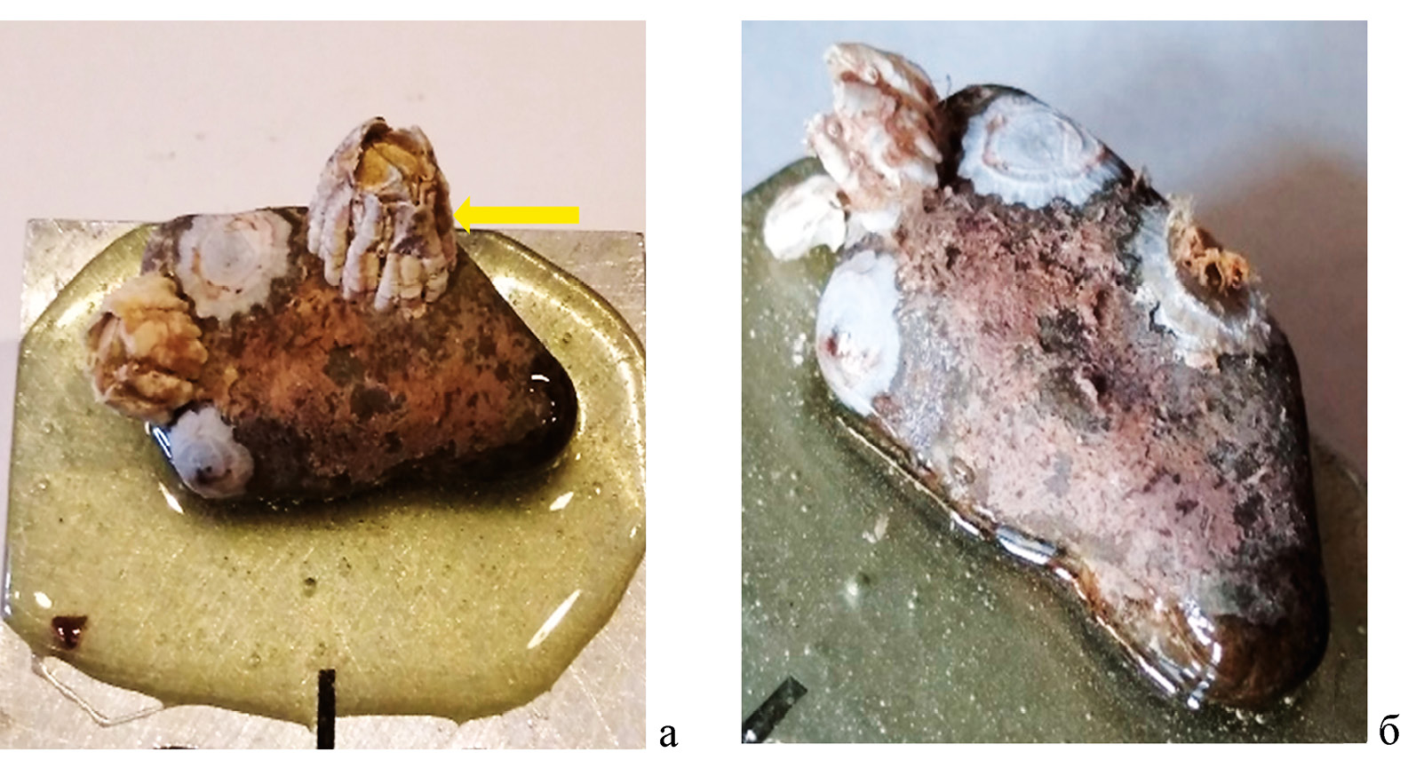 Партия образцов из Баренцева моря (рис. 1, б) состояла из трех групп домиков Balanus eburneus на природном субстрате – камнях, к которым прикрепились рачки. При испытаниях камни с домиками приклеивались эпоксидной смолой к металлическим подложкам так, чтобы плоский пуансон при движении давил только на домик. В качестве иллюстрации показан образец № 1 (рис. 1, б) перед испытанием (рис. 4, а) и после отрыва домика от субстрата (рис. 4, б). Стрелкой показано направление нагружения.