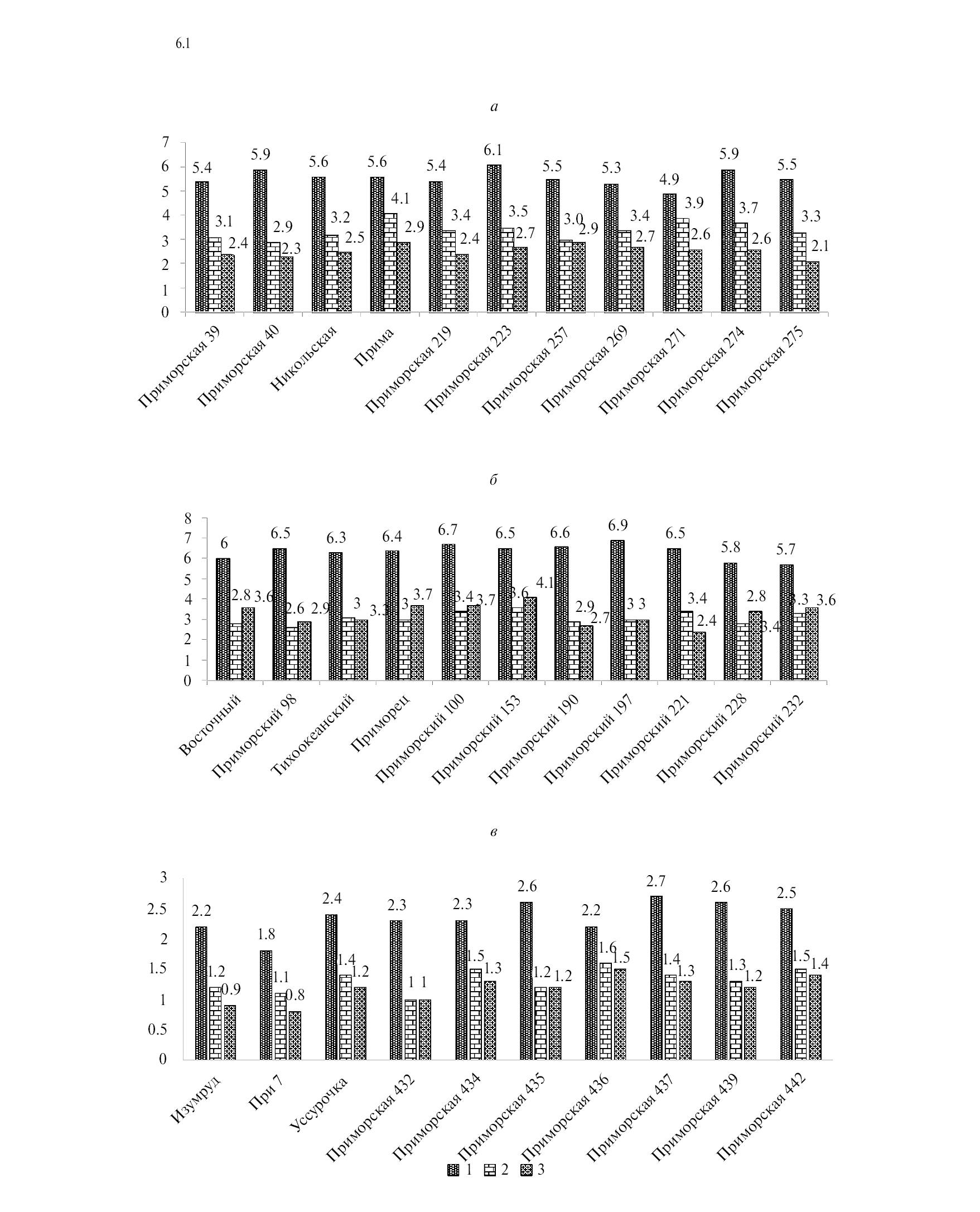 Рис. 1. Урожайность (т/га) сортов конкурсного испытания: а – яровой мягкой пшеницы, б – ярового ячменя, в – гречихи; 1 – 2021 г., 2 – 2022 г., 3 – 2023 г.
