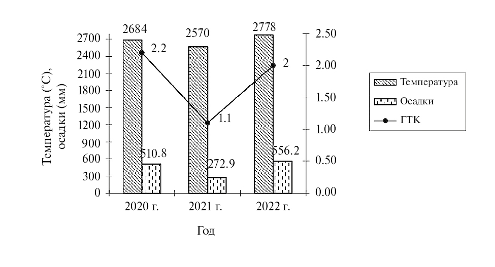 Сумма активных температур в 2020–2022 гг. свыше 10 оС составила 2570–2778 оС, а сумма осадков за апрель–август – 272,2–556,2 мм. В соответствии с ГТК 2020 г. характеризуется как избыточно влажный, 2021 г. – умеренно влажный и 2022 г. – влажный (рис. 1).