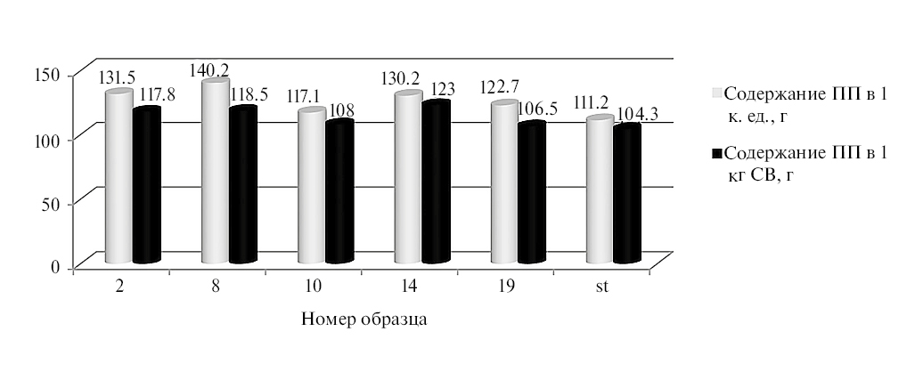 Среди изученных в 2021 г. генотипов (F2–F4) значительно превышают стандарт по содержанию ПП в 1 кг СВ гибридные образцы № 34 (Немчиновская юбилейная × Омичка 3) и № 1 (Луговская 85 × № 2252) – 190,1–198,5 г (рис. 3). Обеспеченность ПП 1 к. ед. у данных образцов превышала сорт Луговская 85 на 20,9–47,7 г.