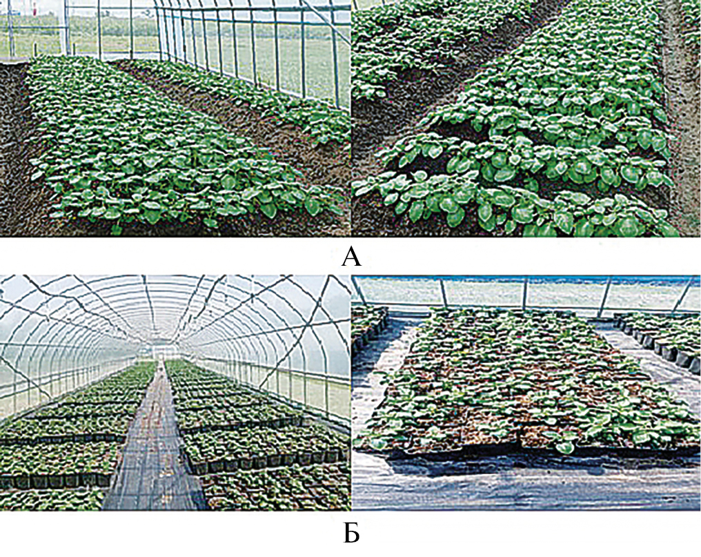 Посадку исходного материала выполнили согласно агросрокам в III декаде мая. Опыт закладывали в 4-кратной повторности по 50 растений. В вариантах с посадкой в грядах густота стояния растений составила 20 шт./м2. После посадки растений из пробирок в теплицу для снижения негативных последствий стрессовой ситуации при пересадке проводили обработку стимуляторами роста Гетероауксин (1 г/10 л) и Эпин Экстра (1 мл/5 л). Обработка осуществлялась вручную до полного промачивания почвы. Для защиты растений от грибных болезней и вредителей выполнили 4 обработки фунгицидами и инсектицидами (Ревус Топ 0,6 л/га, Ридомил Голд МЦ 2,5 кг/га, Конфидор Экстра ВДГ 0,05 кг/га, Актара 0,6 кг/га).