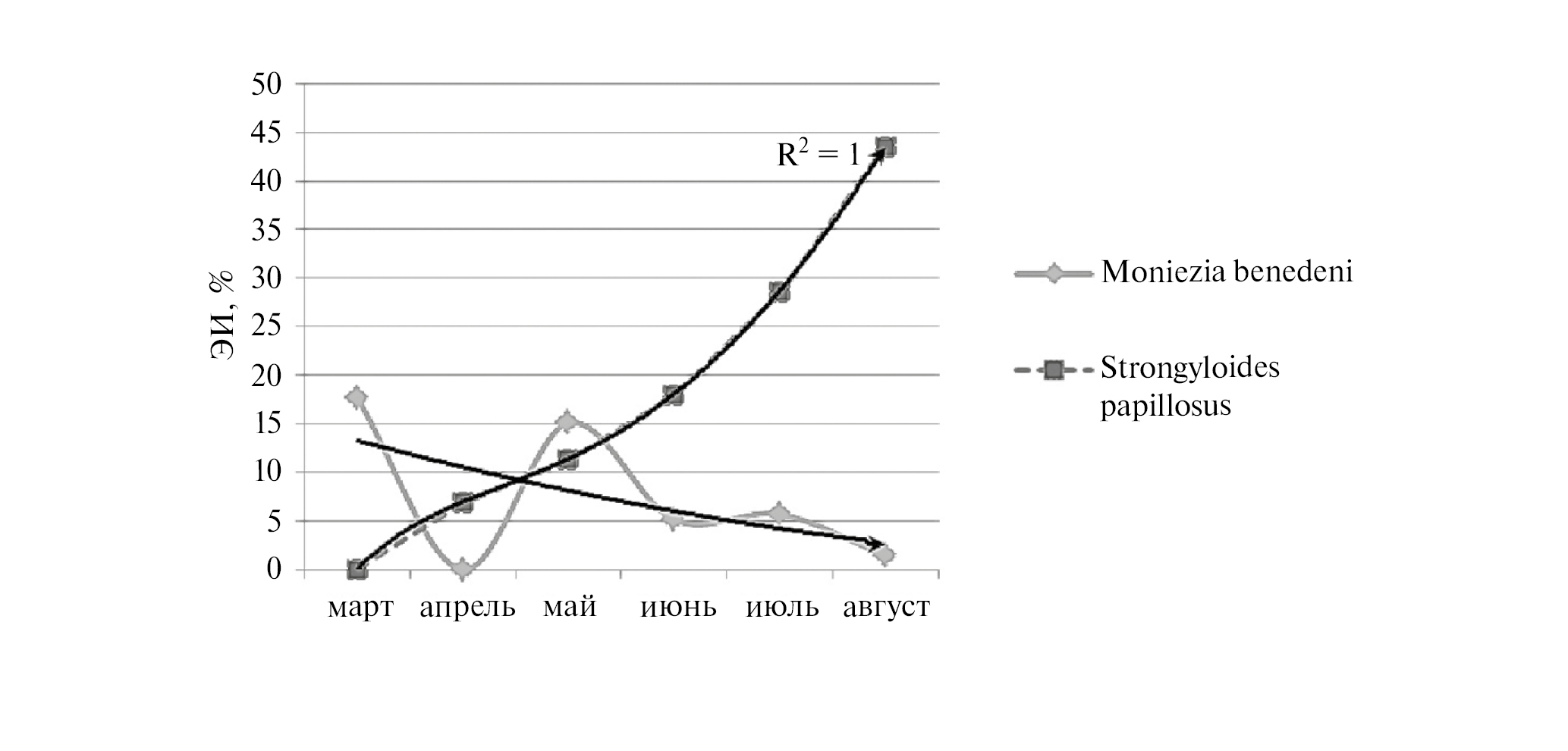Для M. benedeni было характерно снижение экстенсивности инвазии с марта (ЭИ = 17,65%) по август (ЭИ = 1,45%). Выявление яиц и личинок S. papillosus регистрировалось с апреля по август. При этом экстенсивность инвазии увеличивалась по нарастающей: наименьшие показатели отмечены в апреле (ЭИ = 6,90%), наибольшие – в августе (ЭИ = 43,48%) (см. рисунок).