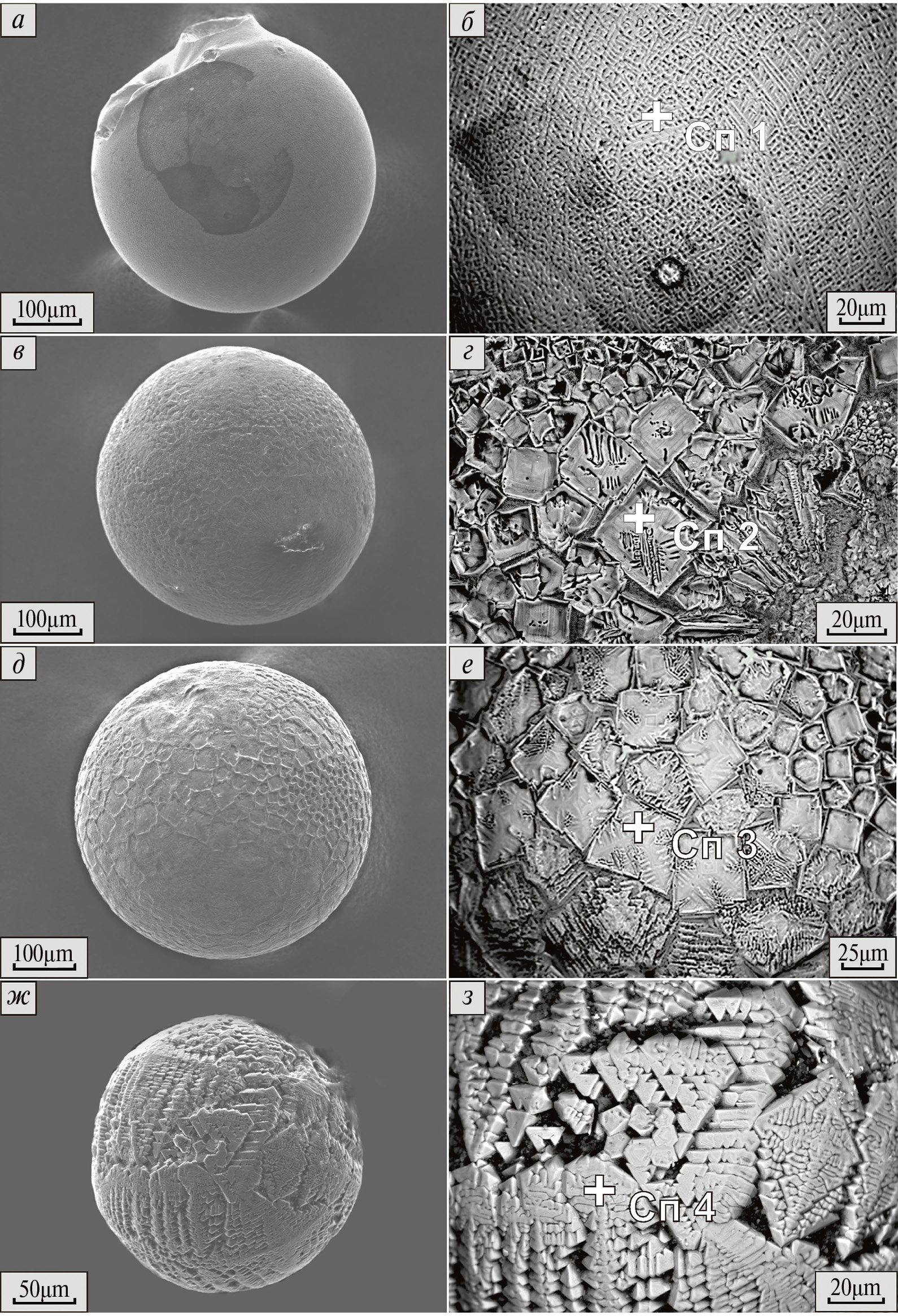 Изучена морфология микросферул из базитовых позднепермских интрузивов острова Попова (Приморье) [16]. Установлено, что большинство этих микрообъектов отвечает идеальным сфероидам, реже наблюдаются слабо деформированные образования с микрократерными воронками и конусами. Их размеры колеблются от ~200 до ~700 мкм, при этом они обладают различной микроструктурой поверхности, но сходным магнетитовым составом (рис. 2, табл. 2). В одних частицах микроструктура состоит из относительно крупных блоков мозаики различной конфигурации (рис. 2, б), в других – из полиэдров сходных очертаний (рис. 2, г). Характерна также тонкая структура с концентрической направленностью (рис. 2, е). В остальных поверхность слагается дендритоидами и различных форм полиэдрами (рис. 2, ж, з). На поверхности ряда сфероидов установлены почти идеальные дендриты. Среди сфероидов встречаются пустотелые образования, толщина их оболочки обычно составляет около 20 мкм и выше. Другие сфероиды имеют толстые стенки.