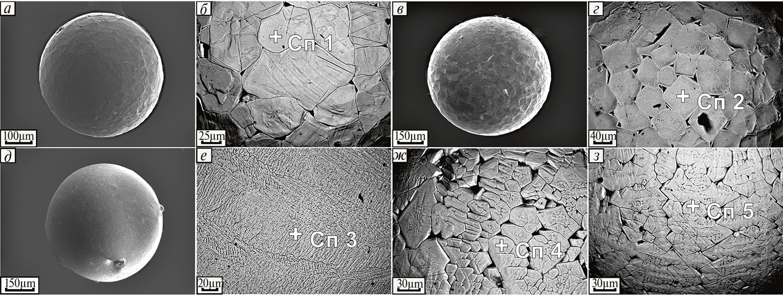 Рис. 2. Микроснимки сферул (а, в, д) и их микроструктуры поверхности (б, г, е, ж, з). Сп1–Сп5 – точки ЭДР анализа. Снимки а, в, д получены во вторичных электронах; снимки б, г, е, ж, з – в упруго-рассеянных электронах