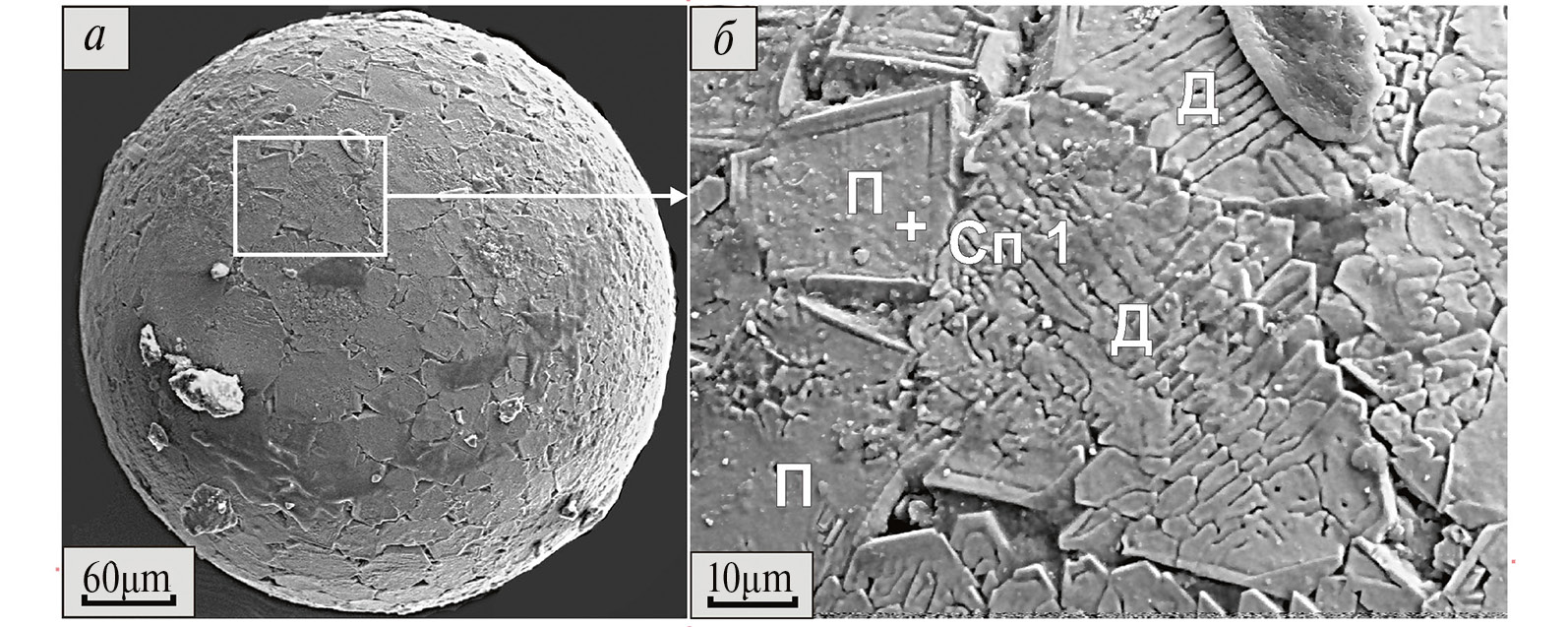 Рис. 3. Микроснимки Fe-оксидной сферулы (а) и ее микроструктуры (б), состоящие из полиэдров (П) и дендритоидов (Д). Сп1 – точка ЭДР анализа. Снято во вторичных электронах