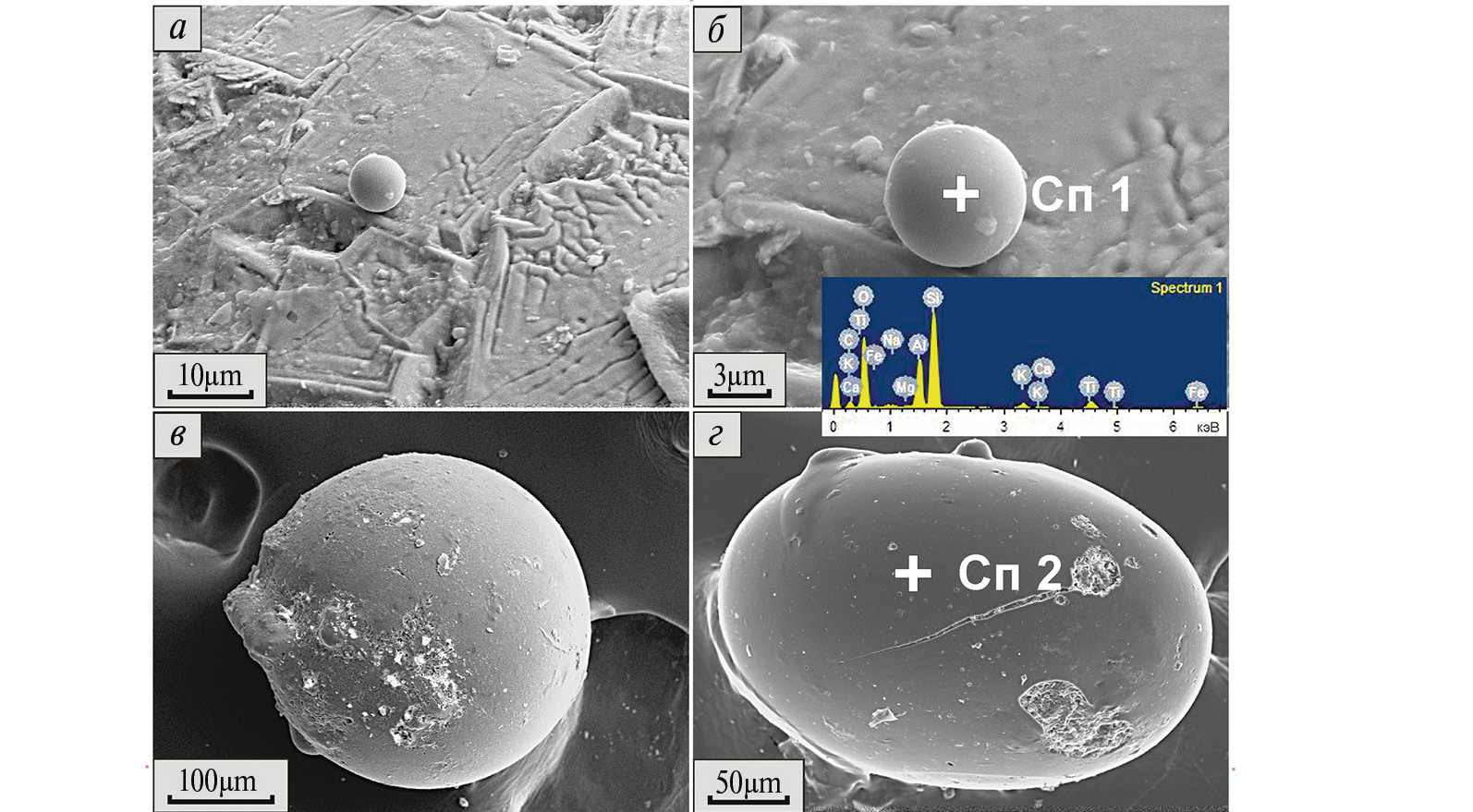 Рис. 4. Микроснимки алюмосиликатных шариков: а – шарик на поверхности крупного Fe-оксидного сфероида; б – он же при большем увеличении; в – алюмосиликатный шарик; г – эллипсоидальное железо-алюмосиликатное образование; Сп1 и Сп2 – точки ЭДР анализа. Спектр 1 показан на рисунке. Снято во вторичных электронах