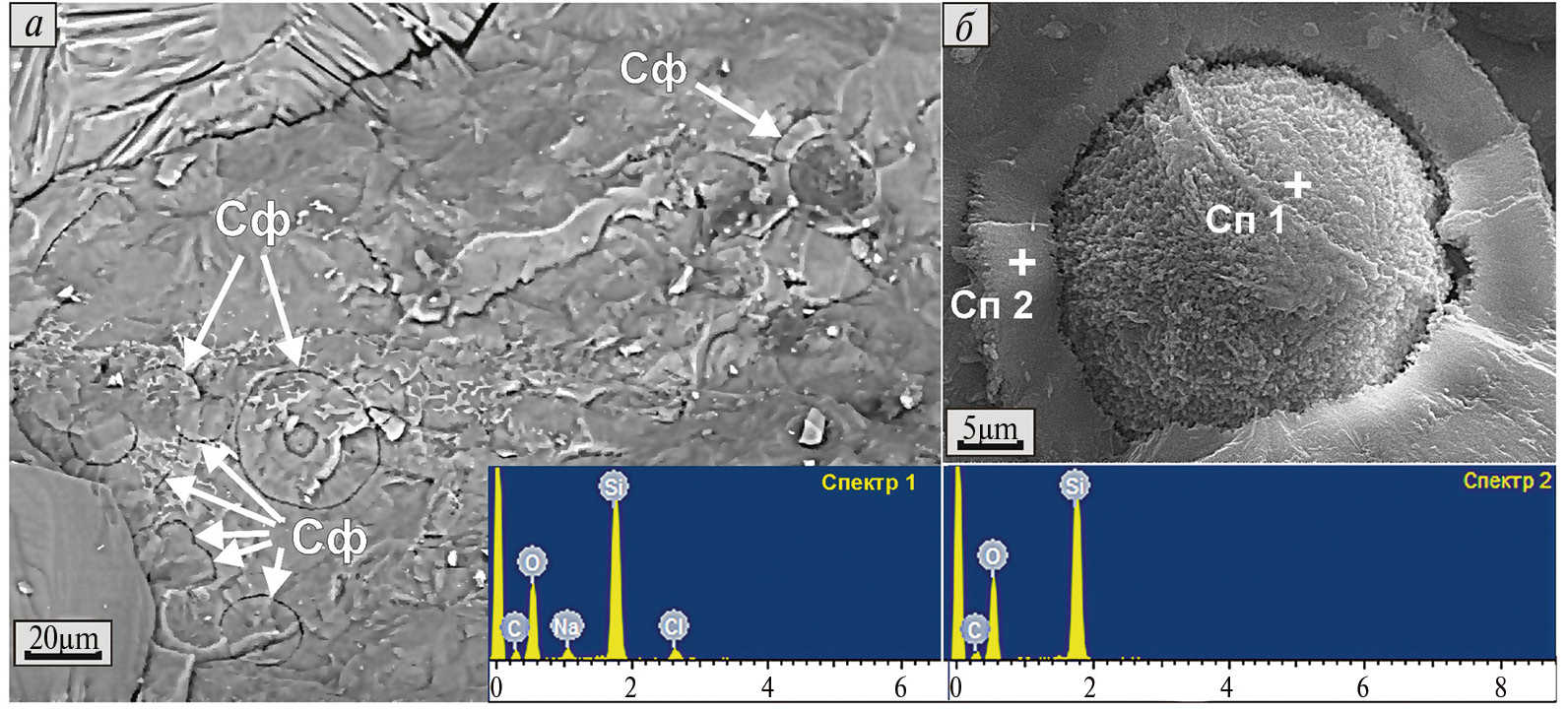 Рис. 5. Сфероидные образования (Сф) в стекловатой вулканической породе (а) и отдельный препарированный индивид (б) с точками ЭДР анализа Сп1 и Сп2. Снято во вторичных электронах