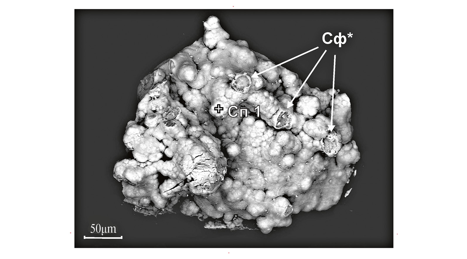 Исследованы продукты флюидной углекислотной деструкции широкого спектра силикатных пород (базальтов, риолитов, зеленых сланцев), представленные гидроалюмосиликатным матриксом и железомарганцевыми, первично коллоидными, стяжениями, корками, микроконкрециями конденсатной природы, обогащенными Co, Ni, Ba, Ce, Pb [17, 18, 19]. В них установлены сфероидальные и близкие к ним по структуре обособления, размерностью от ~1–5 до 100–200 мкм. Интересен агрегат (рис. 6), состоящий из множества сросшихся сфероидов Со–Ni–Fe–Mn–O состава (табл. 5), выполняющий газовые полости в базальтах Борисовского вулкана (Западное Приморье).