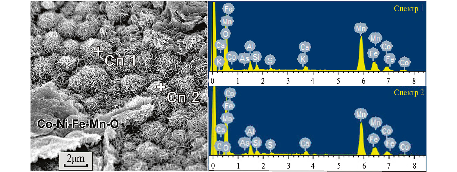 Встречаются континентальные железомарганцевые корки, стяжения, состоящие из сфероидальных выделений Со–Fe–Mn–O и Со–Ni–Fe–Mn–O состава, покрытых густой сетью жгутиковых новообразований аналогичного состава (рис. 7).