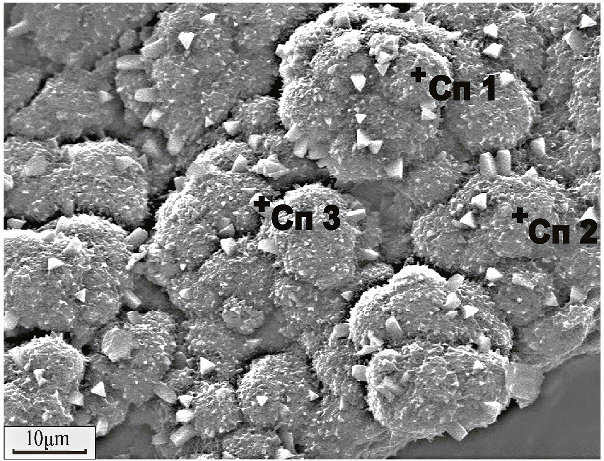 Рис. 8. Сфероидальные микрообразования Ni–Co–Ba–Fe–Mn-гидрооксидной корки с порфировидной структурой. Сп1, Сп2 и Сп3 – точки ЭДР анализа. Снято во вторичных электронах