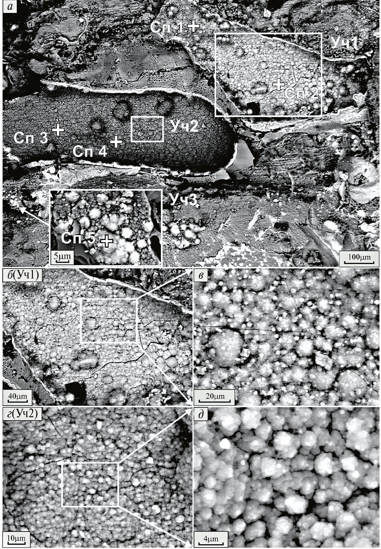 Рис. 9. Микроснимки полости газового канала в базальте, выстланного микро- и наноглобулярными новообразованиями гидроалюмосиликатного и металл-гидрооксидного состава: а – общий вид полости с выделенными для изучения участками Уч1, Уч2, Уч3; б(Уч1) – участок 1 при большем увеличении, в нем выделен участок, показанный при большем увеличении на снимке в; г(Уч2) – участок 2 при большем увеличении, в нем выделен участок, показанный при большем увеличении на снимке д; Участок 3 – микро-, наноглобулярный Ce–Co–Ba–Fe–Mn-гидрооксидный конденсат. Сп1–5-0 Сп5 – точки проведения ЭДР анализов. Снято в упруго-рассеянных электронах